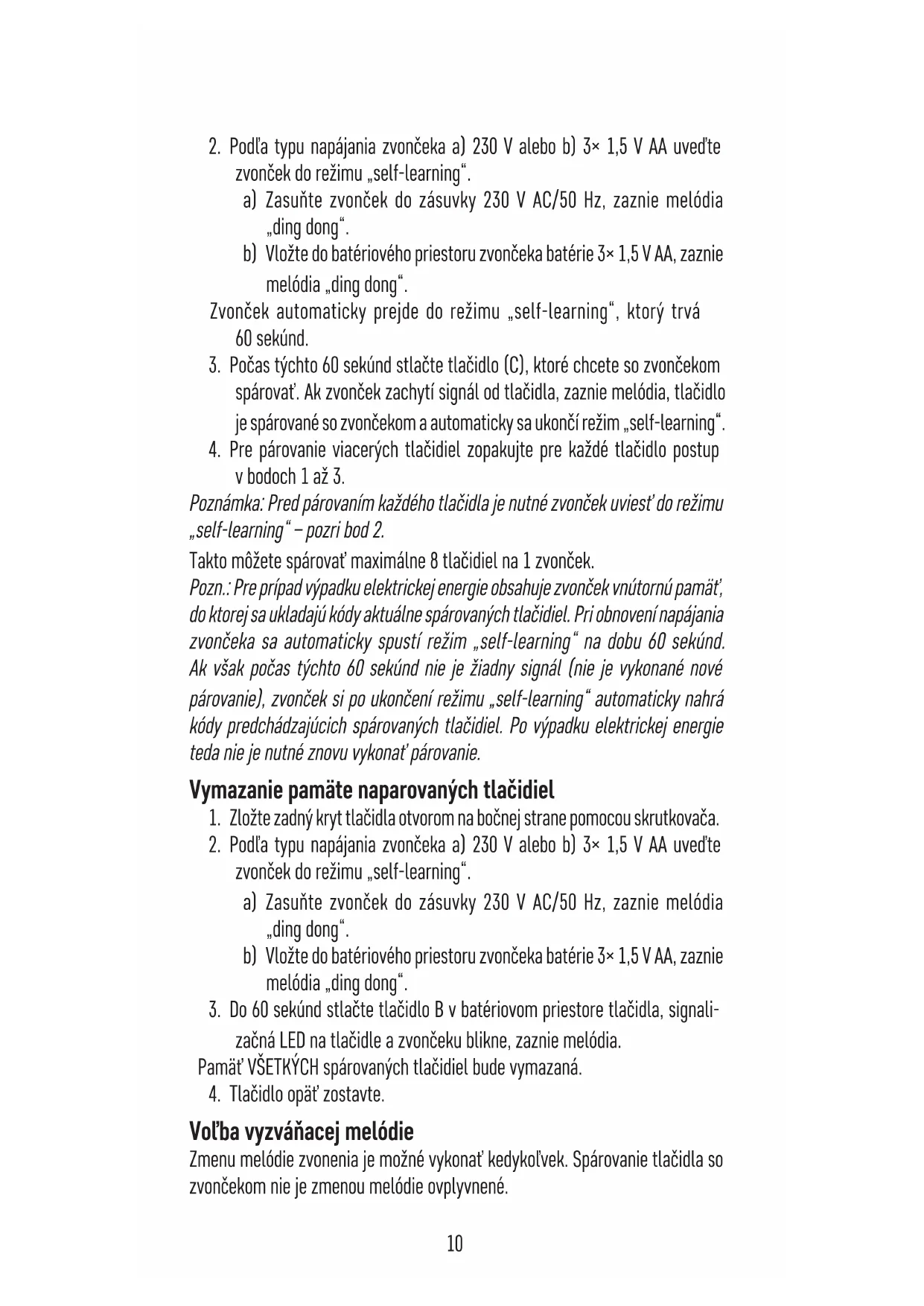v bodoch 1 až 3. Poznámka: Pred párovaním každého tlačidla je nutné zvonček uviesť do režimu „self-learning“ – pozri bod 2. Takto môžete spárovať maximálne 8 tlačidiel na 1 zvonček. Pozn.: Pre prípad výpadku elektrickej energie obsahuje zvonček vnútornú pamäť, do ktorej sa ukladajú kódy aktuálne spárovaných tlačidiel. Pri obnovení napájania zvončeka sa automaticky spustí režim „self-learning“ na dobu 60 sekúnd. Ak však počas týchto 60 sekúnd nie je žiadny signál (nie je vykonané nové párovanie), zvonček si po ukončení režimu „self-learning“ automaticky nahrá kódy predchádzajúcich spárovaných tlačidiel. Po výpadku elektrickej energie teda nie je nutné znovu vykonať párovanie. Vymazanie pamäte naparovaných tlačidiel