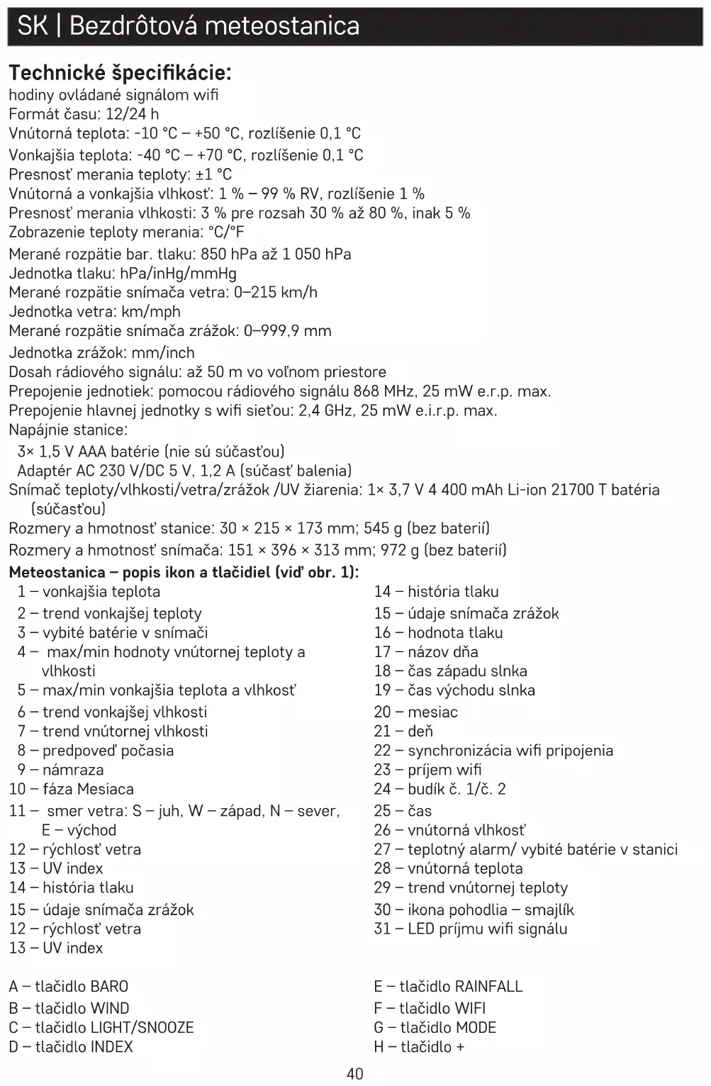 Poznámka: V senzore je vstavaný solárny panel, ktorý priebežne nabíja batériu. Rýchlosť nabíjania závisí od intenzity slnečného žiarenia – slúži len ako doplnok. V zimných mesiacoch sa odporúča vždy nabíjať batériu pomocou priloženej USB nabíjačky.42 Hodiny riadené wi Aktuálny čas/dátum načíta stanica automaticky po pripojení k wi sieti. Bude zobrazená ikona