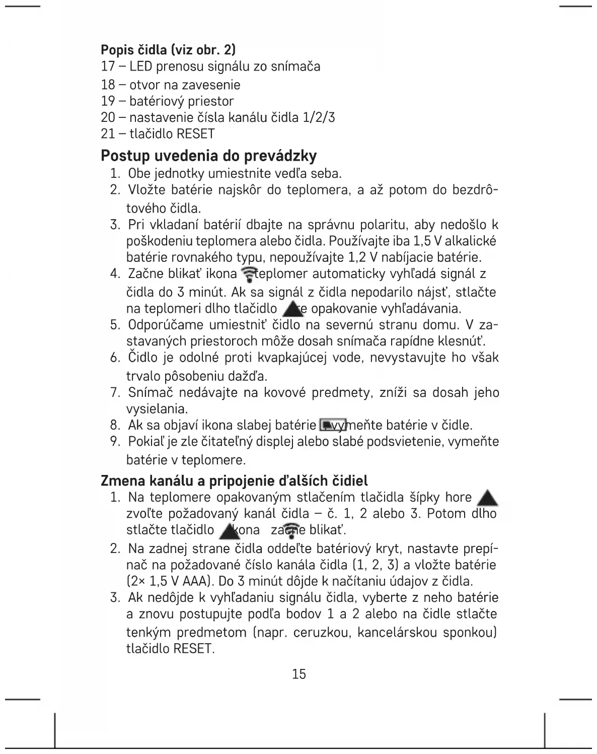 nač na požadované číslo kanála čidla (1, 2, 3) a vložte batérie (2× 1,5 V AAA). Do 3 minút dôjde k načítaniu údajov z čidla.