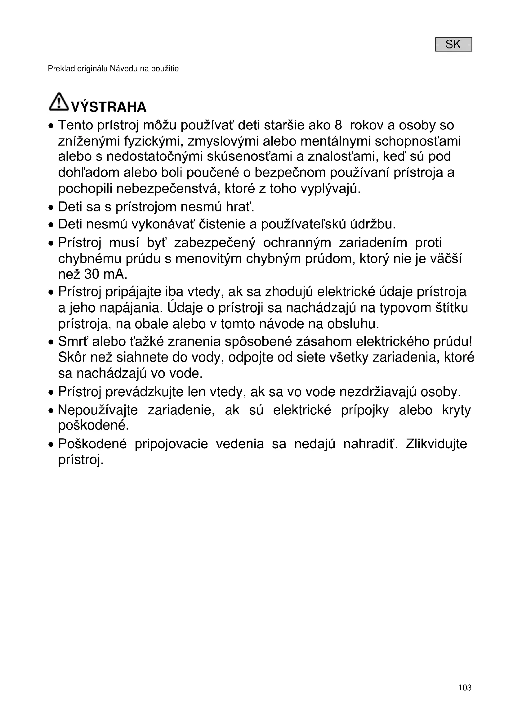 VÝSTRAHA VÝSTRAHA Tento prístroj môžu používať deti staršie ako 8 rokov a osoby so zníženými fyzickými, zmyslovými alebo mentálnymi schopnosťami alebo s nedostatočnými skúsenosťami a znalosťami, keď sú pod dohľadom alebo boli poučené o bezpečnom používaní prístroja a pochopili nebezpečenstvá, ktoré z toho vyplývajú. Deti sa s prístrojom nesmú hrať. Deti nesmú vykonávať čistenie a používateľskú údržbu. Prístroj musí byť zabezpečený ochranným zariadením proti chybnému prúdu s menovitým chybným prúdom, ktorý nie je väčší než 30 mA. Prístroj pripájajte iba vtedy, ak sa zhodujú elektrické údaje prístroja a jeho napájania. Údaje o prístroji sa nachádzajú na typovom štítku prístroja, na obale alebo v tomto návode na obsluhu. Smrť alebo ťažké zranenia spôsobené zásahom elektrického prúdu! Skôr než siahnete do vody, odpojte od siete všetky zariadenia, ktoré sa nachádzajú vo vode. Prístroj prevádzkujte len vtedy, ak sa vo vode nezdržiavajú osoby. Nepoužívajte zariadenie, ak sú elektrické prípojky alebo kryty poškodené. Poškodené pripojovacie vedenia sa nedajú nahradiť. Zlikvidujte prístroj.- SK -