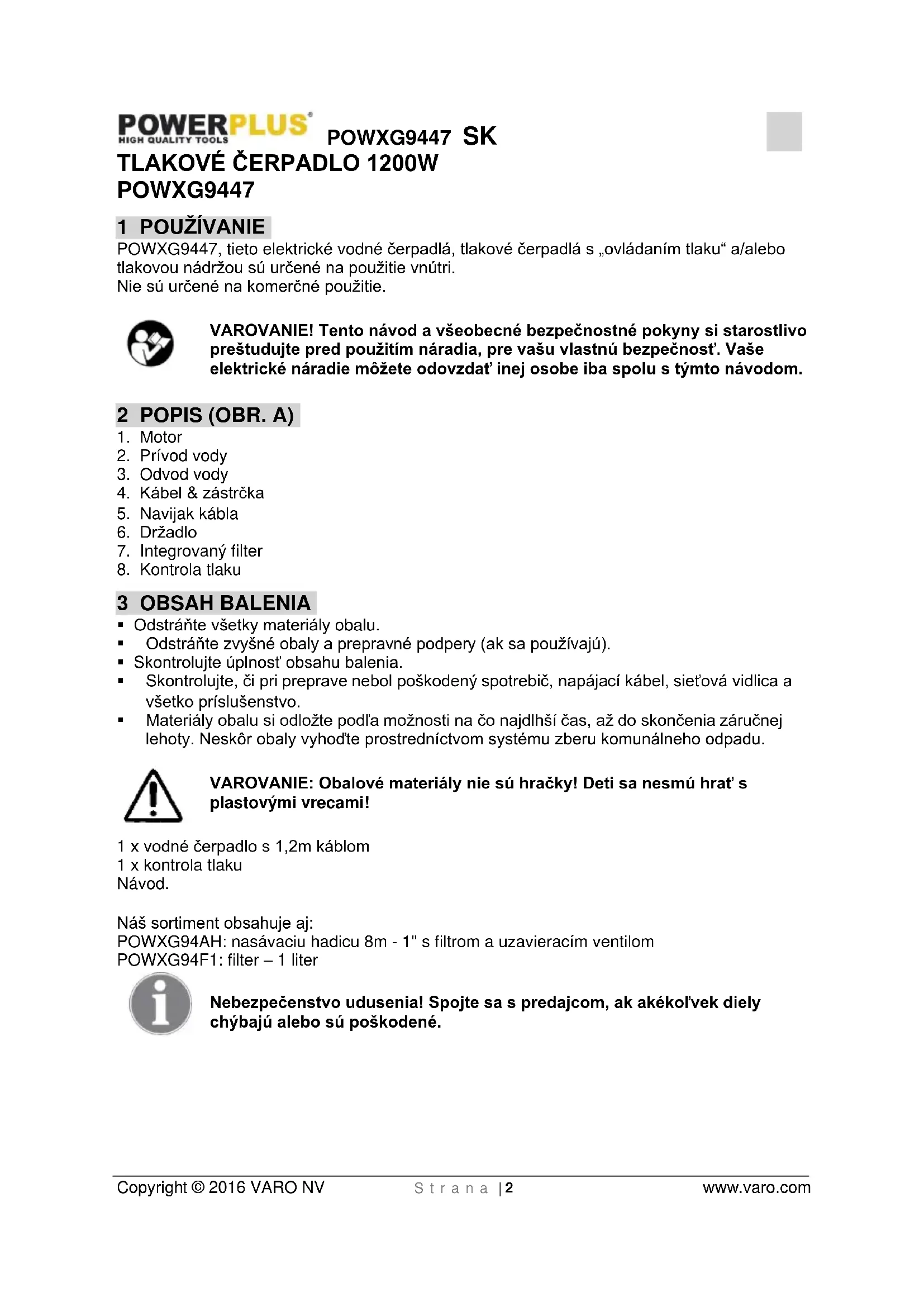 Napájací zdroj musí spĺňať technické požiadavky zobrazené na produkte. Podmienky pripojenia si pozrite v pokynoch vášho dodávateľa energie. Ak čerpadlo alebo napájací kábel nespĺňajú požiadavky, nepripájajte čerpadlo! Čerpadlo nikdy nenoste za kábel.POWXG9447 SK Copyright © 2016 VARO NV S t r a n a | 5 www.varo.com Nikdy neodstraňujte zástrčku a neskracujte kábel. V opačnom prípade dôjde k zániku vašej záruky. Pripojenie (zástrčku a zásuvku) udržiavajte suché. Čerpadlo nie je vhodné na použitie v bazénoch a jazerách alebo pri iných situáciách, kde by mohli prísť ľudia do fyzického kontaktu s vodou, a preto sa nesmie používať na tento účel. Pri čistení alebo vykonávaní údržby jazierka čerpadlo vždy odpojte od napájacieho zdroja. Toto čerpadlo je vhodné na čerpanie vody s minimálnou teplotou 4°C a maximálnou teplotou 35°C. Čerpadlo nesmie bežať naprázdno, pretože by to spôsobilo trvalú škodu. Ak chcete čerpadlo čistiť alebo robiť na ňom údržbu, vždy ho odpojte od elektrickej siete. Z času na čas vyčistite komory, opláchnite ich čistou vodou, čím zabezpečíte, že nebudú upchaté nečistotami.