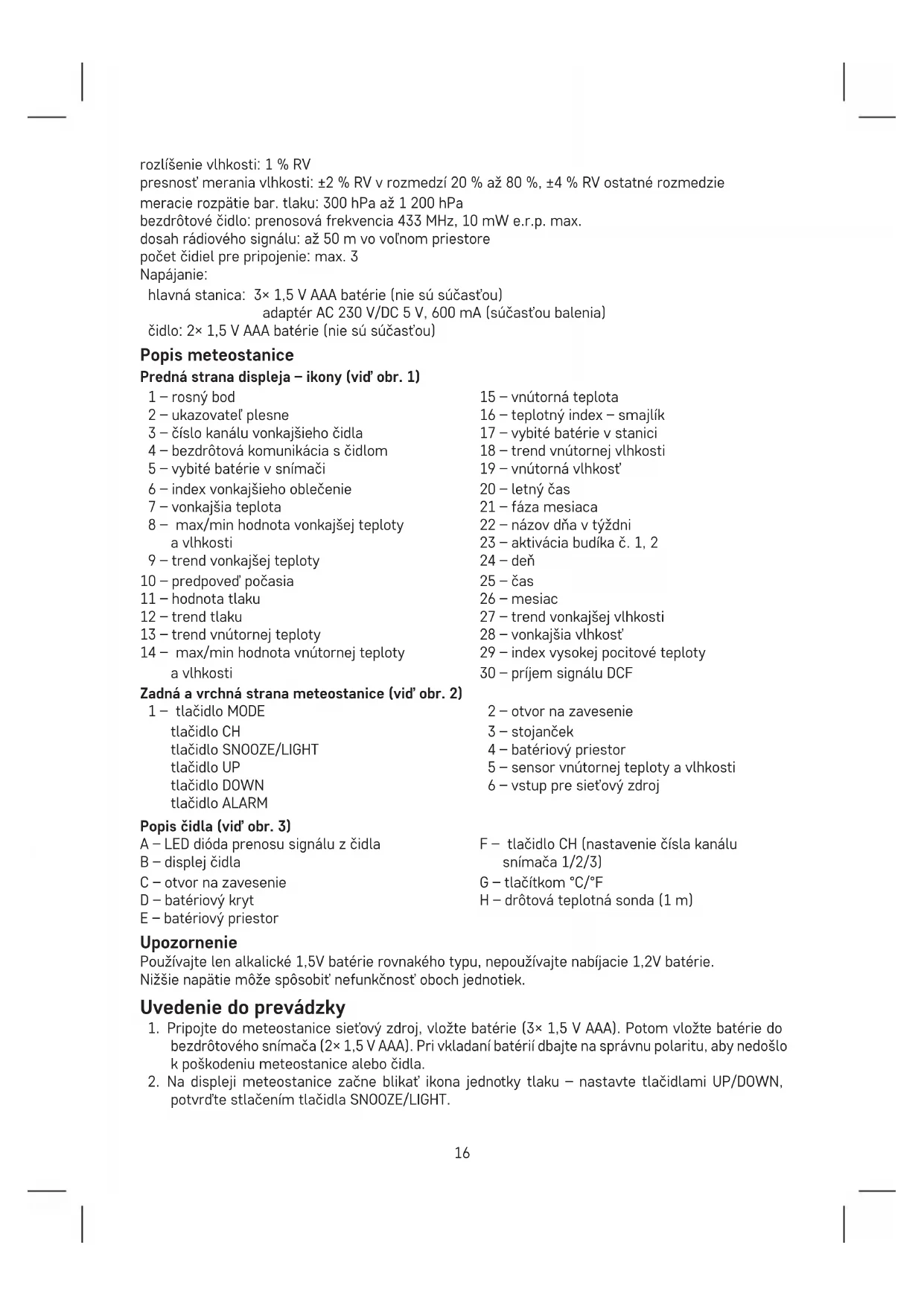 1 – slnečno 2 – oblačno 3 – zamračené 4 – dážď/sneženie pri vonkajšej teplote nižšej ako -1°C 5 – silný dážď/sneženie pri vonkajšej teplote nižšej ako -1°C 6 – búrka/sneženie pri vonkajšej teplote nižšej ako -1°C Bezpečnostné pokyny a upozornenia Pred použitím zariadenia preštudujte návod na použitie. Dbajte bezpečnostných pokynov uvedených v tomto návode. Výrobok je navrhnutý tak, aby pri vhodnom zaobchádzaní spoľahlivo slúžil niekoľko rokov.