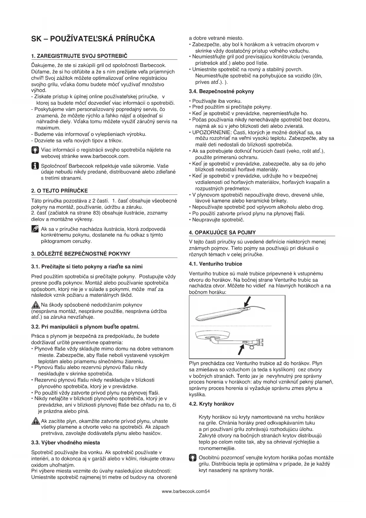 V tejto časti príručky sú uvedené denície niektorých menej známych pojmov. Tieto pojmy sa používajú pri diskusii o rôznych témach v celej príručke. 4.1. Venturiho trubice Venturiho trubice sú malé trubice pripevnené k vstupnému otvoru do horákov. Na bočnej strane Venturiho trubíc sa nachádza otvor. Môžete ho vidieť na hlavných horákoch a na bočnom horáku: Plyn prechádza cez Venturiho trubice až do horákov. Plyn sa zmiešava so vzduchom (a teda s kyslíkom) cez otvory v bočných stranách. Tento jav je nevyhnutný pre správny proces horenia v horákoch: aby mohol vzniknúť pekný plameň, správny proces horenia si vyžaduje správnu zmes plynu a kyslíka. 4.2. Kryty horákov Kryty horákov sú kryty namontované na vrchu horákov na grile. Chránia horáky pred odkvapkávaním tuku a pri používaní grilu zohrávajú rozhodujúcu úlohu. Zakryté otvory na bočných stranách krytov distribuujú teplo po celom rošte tak, aby sa ohrieval rýchlejšie a rovnomernejšie. Osobitnú pozornosť venujte krytom horáka počas montáže grilu. Distribúcia tepla je optimálna v prípade, že je každý kryt nasadený na správny horák. www.barbecook.com544.3. Smalt Niektoré časti spotrebiča sú pokryté vrstvou roztaveného skla, tiež nazývaného smalt. Tento smalt chráni základný kov pred koróziou. Smalt je vysokokvalitný materiál: je odolný voči korózii, nerozkladá sa pod vplyvom vysokých teplôt a veľmi ľahko sa udržiava. Keďže smalt je menej pružný ako kov, na ktorý sa nanáša, kúsky smaltu sa môžu pri nesprávnom používaní spotrebiča poškodiť. Aby ste sa vyhli tomuto problému, pri montáži smaltovaných častí musíte byť opatrní a vždy musíte udržiavať smalt podľa pokynov v tejto príručke. 4.4. Vzbĺknutie Vzbĺknutie sú náhle plamene, ktoré pri grilovaní vyšľahnú z misy. Zvyčajne je spôsobené odkvapkávaním tuku alebo marinády.