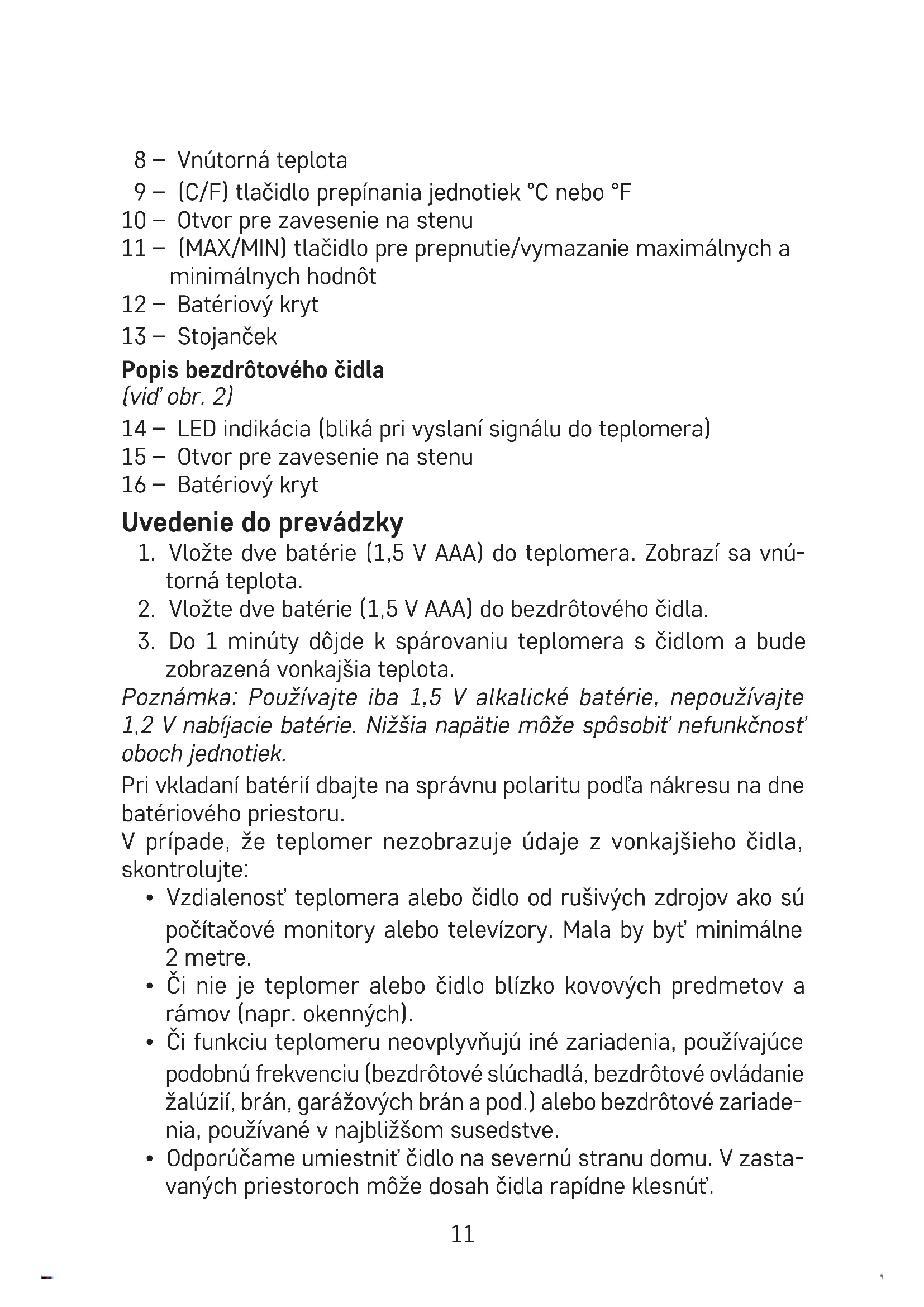 - Či funkciu teplomeru neovplyvňujú iné zariadenia, používajúce podobnú frekvenciu (bezdrôtové slúchadlá, bezdrôtové ovládanie žalúzií, brán, garážových brán a pod.) alebo bezdrôtové zariade- nia, používané v najbližšom susedstve.