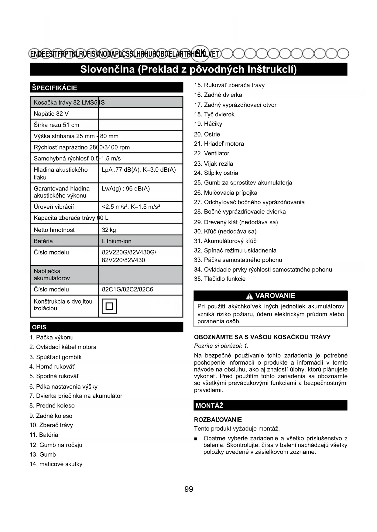 EN DE ES IT FR PT NL RU FI SV NO DA PL CS SL HR HU RO BG EL AR TR HE LT LV ET ŠPECIFIKÁCIEKosačka trávy 82 LMS51SNapätie 82 VŠírka rezu 51 cmVýška strihania 25 mm - 80 mmRýchlosť naprázdno 2800/3400 rpmSamohybná rýchlosť 0.5-1.5 m/sHladina akustického tlakuLpA :77 dB(A), K=3.0 dB(A)Garantovaná hladina akustického výkonuLwA(g) : 96 dB(A)Úroveň vibrácií <2.5 m/s², K=1.5 m/s²Kapacita zberača trávy 60 LNetto hmotnosť 32 kgBatéria Lithium-ionČíslo modelu 82V220G/82V430G/82V220/82V430Nabíjačka akumulátorovČíslo modelu 82C1G/82C2/82C6Konštrukcia s dvojitou izoláciou OPIS 1. Páčka výkonu2. Ovládací kábel motora3. Spúšťací gombík4. Horná rukoväť5. Spodná rukoväť6. Páka nastavenia výšky7. Dvierka priečinka na akumulátor8. Predné koleso9. Zadné koleso10. Zberač trávy11. Batéria12. Gumb na ročaju13. Gumb14. maticové skutky15. Rukoväť zberača trávy16. Zadné dvierka17. Zadný vyprázdňovací otvor18. Tyč dvierok19. Háčiky20. Ostrie21. Hriadeľ motora22. Ventilator23. Vijak rezila24. Stĺpiky ostria25. Gumb za sprostitev akumulatorja26. Mulčovacia prípojka27. Odchyľovač bočného vyprázdňovania28. Bočné vyprázdňovacie dvierka29. Drevený klát (nedodáva sa)30. Kľúč (nedodáva sa)31. Akumulátorový kľúč32. Spínač režimu uskladnenia33. Páčka samostatného pohonu 34. Ovládacie prvky rýchlosti samostatného pohonu35. Tlačidlo funkcie VAROVANIE Pri použití akýchkoľvek iných jednotiek akumulátorov vzniká riziko požiaru, úderu elektrickým prúdom alebo poranenia osôb. OBOZNÁMTE SA S VAŠOU KOSAČKOU TRÁVYPozrite si obrázok 1. Na bezpečné používanie tohto zariadenia je potrebné pochopenie informácií o produkte a informácií v tomto návode na obsluhu, ako aj znalostí úlohy, ktorú plánujete vykonať. Pred použitím tohto zariadenia sa oboznámte so všetkými prevádzkovými funkciami a bezpečnostnými pravidlami.MONTÁŽROZBAĽOVANIETento produkt vyžaduje montáž. ■ Opatrne vyberte zariadenie a všetko príslušenstvo z balenia. Skontrolujte, či sa v balení nachádzajú všetky položky uvedené v zásielkovom zozname. 99Slovenčina (Preklad z pôvodných inštrukcií)