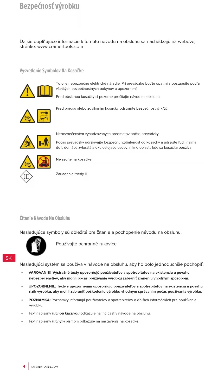 Vysvetlenie Symbolov Na Kosačke Toto je nebezpečné elektrické náradie. Pri prevádzke buďte opatrní a postupujte podľa všetkých bezpečnostných pokynov a upozornení. Pred obsluhou kosačky si pozorne prečítajte návod na obsluhu. Pred prácou alebo zdvíhaním kosačky odstráňte bezpečnostný kľúč. Nebezpečenstvo vyhadzovaných predmetov počas prevádzky. Počas prevádzky udržiavajte bezpečnú vzdialenosť od kosačky a udržujte ľudí, najmä deti, domáce zvieratá a okolostojace osoby, mimo oblasti, kde sa kosačka používa. Nejazdite na kosačke. Zariadenie triedy III Ďalšie doplňujúce informácie k tomuto návodu na obsluhu sa nachádzajú na webovej stránke: www.cramertools.com Čítanie Návodu Na Obsluhu Nasledujúce symboly sú dôležité pre čítanie a pochopenie návodu na obsluhu. Používajte ochranné rukavice Nasledujúci systém sa používa v návode na obsluhu, aby ho bolo jednoduchšie pochopiť: