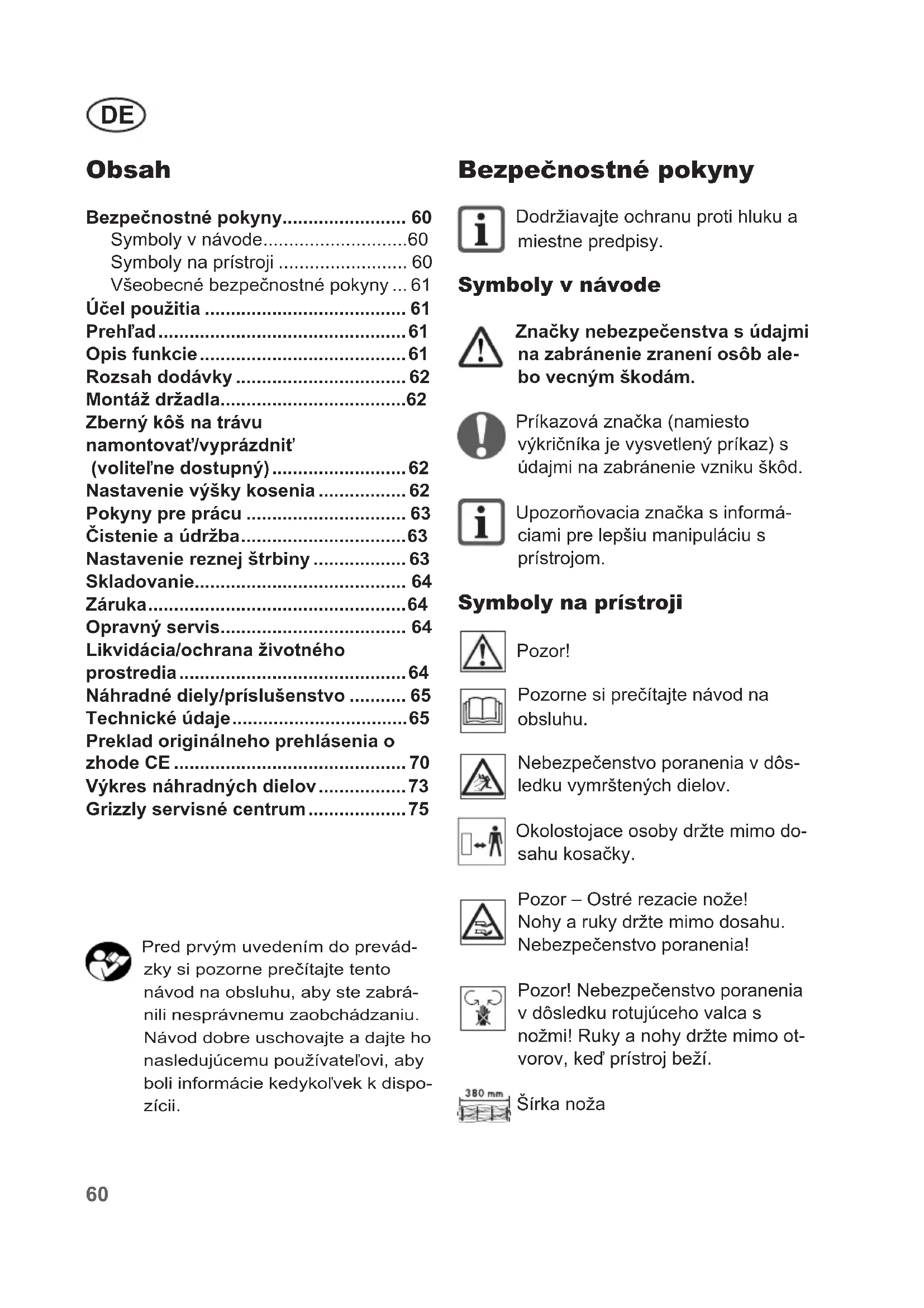 - Bezpečnostné pokyny Dodržiavajte ochranu proti hluku a miestne predpisy. Symboly v návode Značky nebezpečenstva s údajmi na zabránenie zranení osôb ale- bo vecným škodám. Príkazová značka (namiesto výkričníka je vysvetlený príkaz) s údajmi na zabránenie vzniku škôd. Upozorňovacia značka s informá- ciami pre lepšiu manipuláciu s prístrojom. Symboly na prístroji Pozor! Pozorne si prečítajte návod na obsluhu. Nebezpečenstvo poranenia v dôs- ledku vymrštených dielov. Okolostojace osoby držte mimo do- sahu kosačky. Pozor – Ostré rezacie nože! Nohy a ruky držte mimo dosahu. Nebezpečenstvo poranenia! Pozor! Nebezpečenstvo poranenia v dôsledku rotujúceho valca s nožmi! Ruky a nohy držte mimo ot- vorov, keď prístroj beží. Šírka noža Pred prvým uvedením do prevád- zky si pozorne prečítajte tento návod na obsluhu, aby ste zabrá- nili nesprávnemu zaobchádzaniu. Návod dobre uschovajte a dajte ho nasledujúcemu používateľovi, aby boli informácie kedykoľvek k dispo- zícii. Obsah Bezpečnostné pokyny p. 60