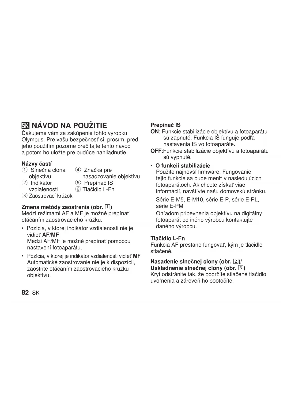 Ďakujeme vám za zakúpenie tohto výrobku Olympus. Pre vašu bezpečnosť si, prosím, pred jeho použitím pozorne prečítajte tento návod a potom ho uložte pre budúce nahliadnutie. Názvy častí 1 Slnečná clona objektívu 2 Indikátor vzdialenosti