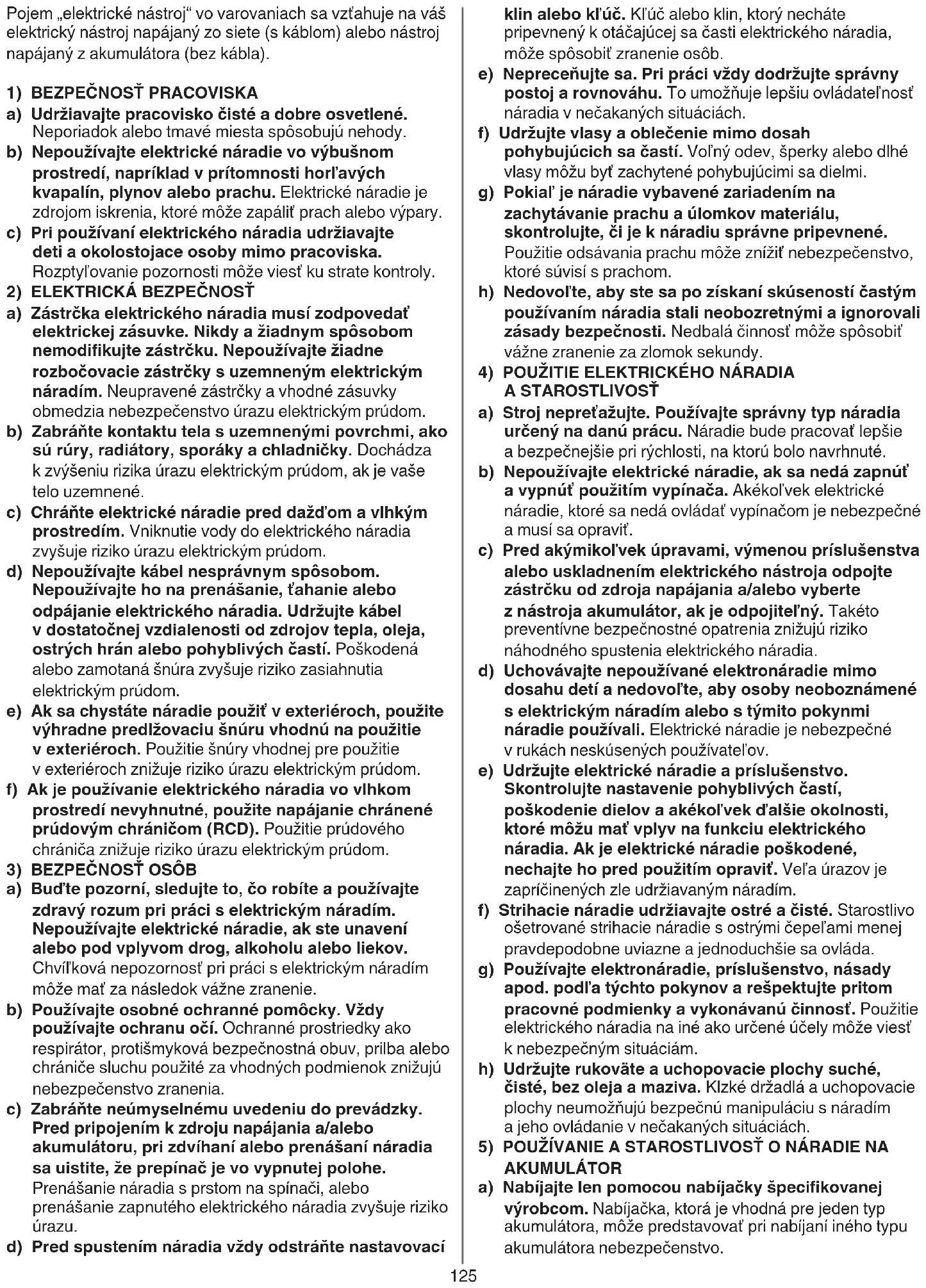 AKUMULÁTOR a) Nabíjajtelenpomocounabíjačkyšpecikovanej výrobcom. Nabíjačka, ktorá je vhodná pre jeden typ akumulátora, môže predstavovať pri nabíjaní iného typu akumulátora nebezpečenstvo. Pojem „elektrické nástroj“ vo varovaniach sa vzťahuje na váš elektrický nástroj napájaný zo siete (s káblom) alebo nástroj napájaný z akumulátora (bez kábla).
