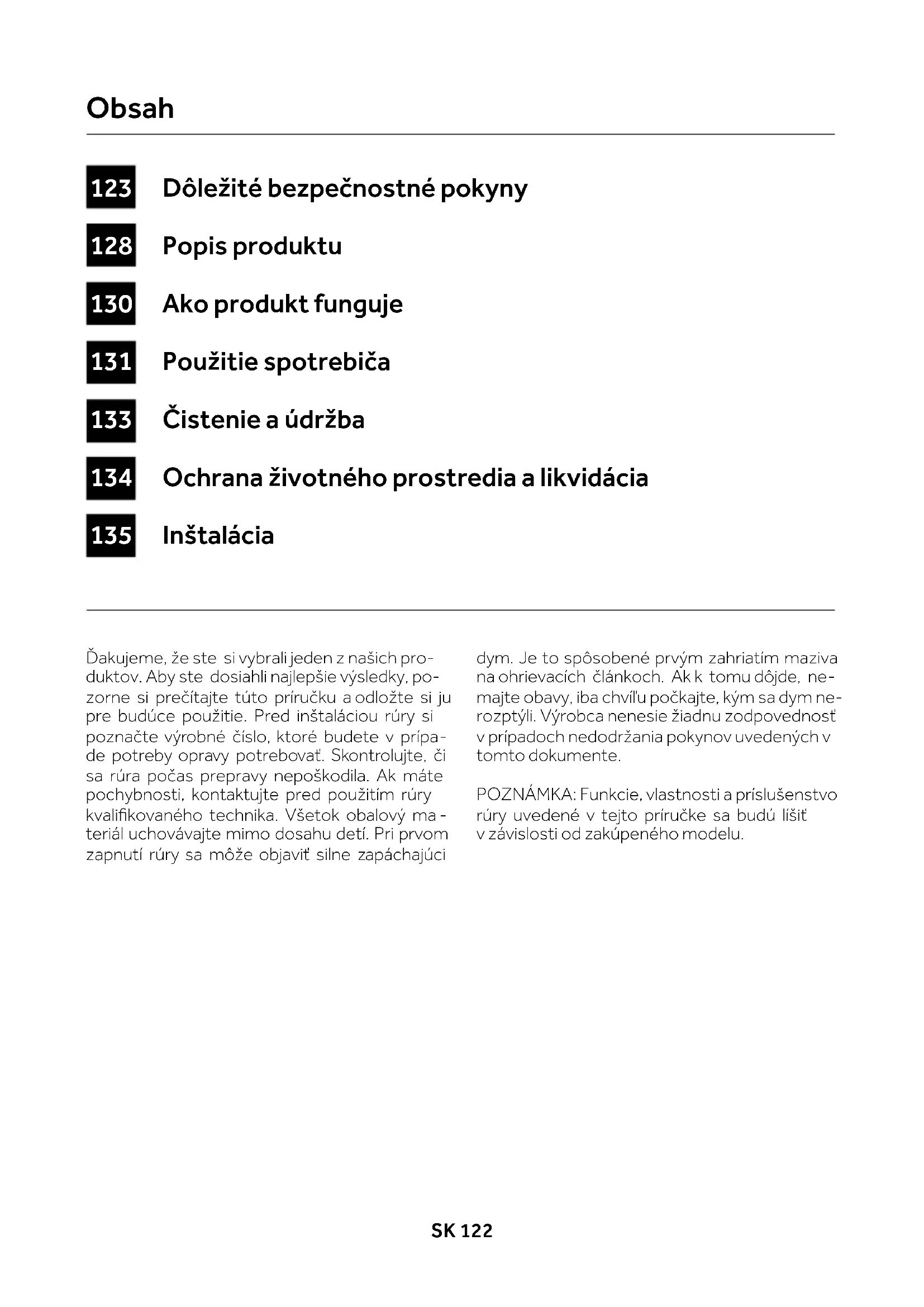 majte obavy, iba chvíľu počkajte, kým sa dym ne- rozptýli. Výrobca nenesie žiadnu zodpovednosť v prípadoch nedodržania pokynov uvedených v tomto dokumente. POZNÁMKA: Funkcie, vlastnosti a príslušenstvo rúry uvedené v tejto príručke sa budú líšiť v závislosti od zakúpeného modelu. Dôležité bezpečnostné pokyny Popis produktu Ako produkt funguje Použitie spotrebiča Čistenie a údržba Ochrana životného prostredia a likvidácia Inštalácia Obsah