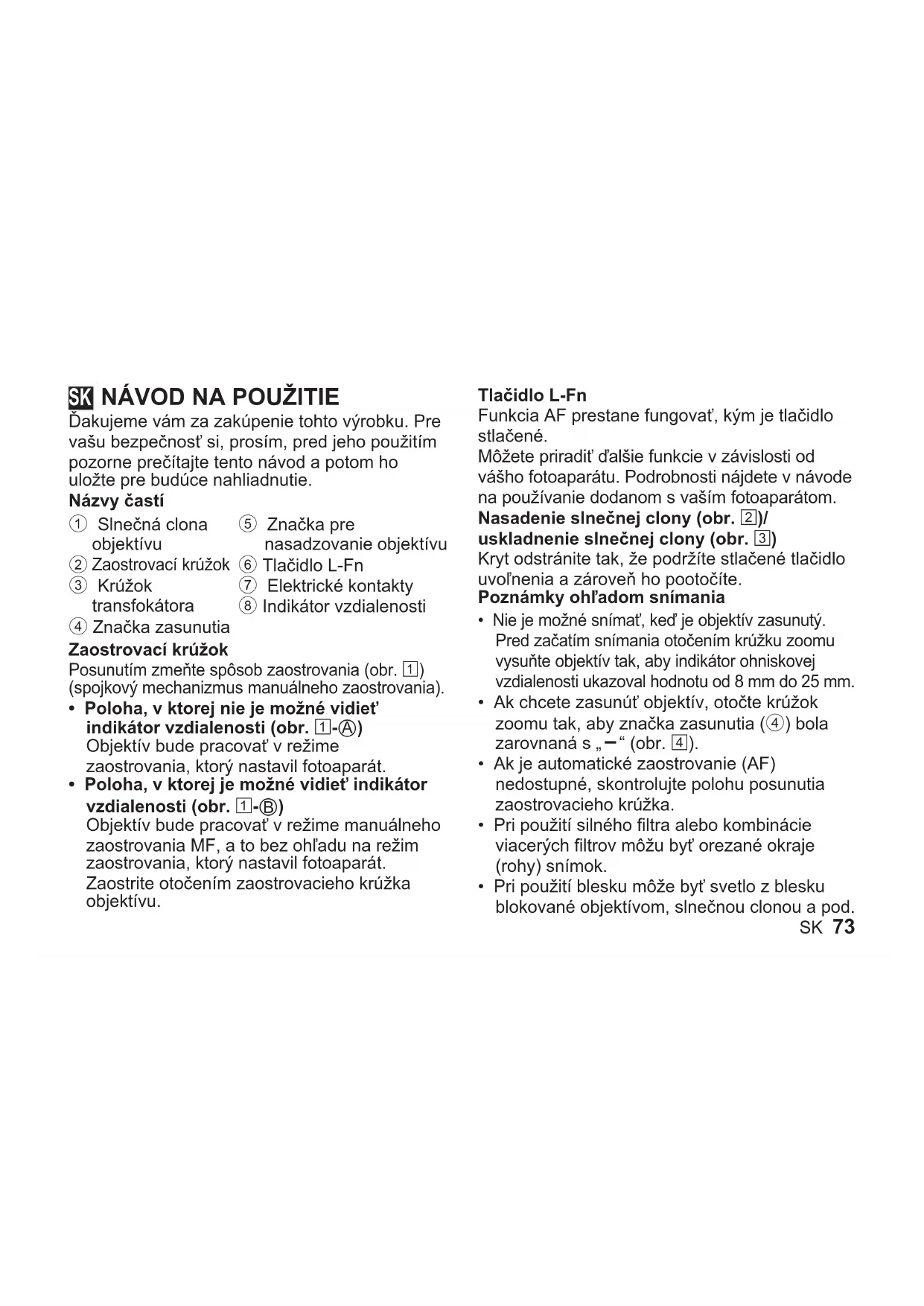 - Nemierte objektívom fotoaparátu priamo na slnko. Slnečné lúče sa v objektíve sústredia a môžu fotoaparát poškodiť alebo spôsobiť požiar. Micro Four Thirds a logo Micro Four Thirds sú ochrannou známkou a registrovanou ochrannou známkou spoločnosti OM Digital Solutions Corporation.SK 75 Pre zákazníkov v Európe Tento symbol [prečiarknutý kontajner s kolieskami WEEE Annex IV] znamená povinnosť triedenia elektrotechnického odpadu v krajinách EÚ. Nevyhadzujte, prosím, zariadenie do bežného komunálneho odpadu. Pri likvidácii nepotrebného zariadenia využite systém zberu triedeného odpadu, ktorý je zavedený vo vašej krajine. Výrobca nebude zodpovedný za porušenie miestnych predpisov vyplývajúce z používania tohto výrobku mimo krajiny alebo oblasti zakúpenia. Softvér v tomto objektíve môže obsahovať softvér tretích strán. Akýkoľvek softvér tretích strán podlieha podmienkam, ktoré boli definované vlastníkmi alebo poskytovateľmi licencie daného softvéru, za ktorých je softvér poskytovaný. Tieto podmienky a ďalšie informácie k softvéru tretích strán, ak existujú, možno nájsť v súbore PDF s informáciami týkajúcimi sa softvéru, umiestnenom na https://cs.olympus-imaging.jp/en/support/imsg/ digicamera/download/notice/notice.cfm76 SL NAVODILA Hvala za nakup tega izdelka. Za zagotovitev varnosti pred uporabo preberite ta priročnik in ga shranite, da bo pri roki za prihodnjo uporabo. Imena delov 1 Sončna zaslonka 2 Ostrilni obroč 3 Obroček za povečavo 4 Oznaka uvlečenja 5 Oznaka za namestitev objektiva 6 Gumb L-Fn 7 Električni kontakti 8 Indikator razdalje Ostrilniobroč Podrsnite, da spremenite način izostritve (sl. 1) (mehanizem sklopke ročne izostritve).