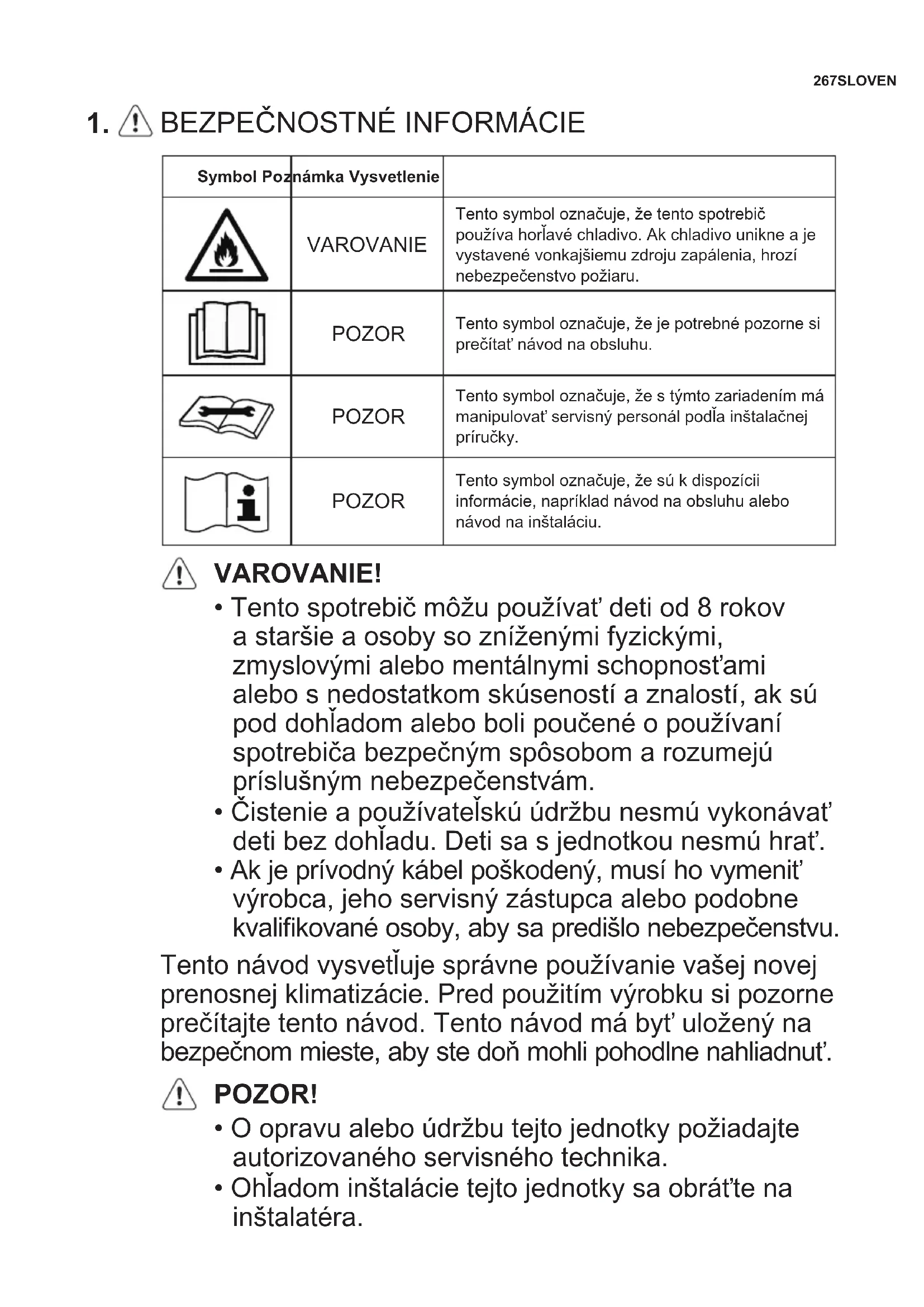 - Ak je prívodný kábel poškodený, musí ho vymeniť výrobca, jeho servisný zástupca alebo podobne kvalikované osoby, aby sa predišlo nebezpečenstvu. Tento návod vysvetľuje správne používanie vašej novej prenosnej klimatizácie. Pred použitím výrobku si pozorne prečítajte tento návod. Tento návod má byť uložený na bezpečnom mieste, aby ste doň mohli pohodlne nahliadnuť. POZOR!