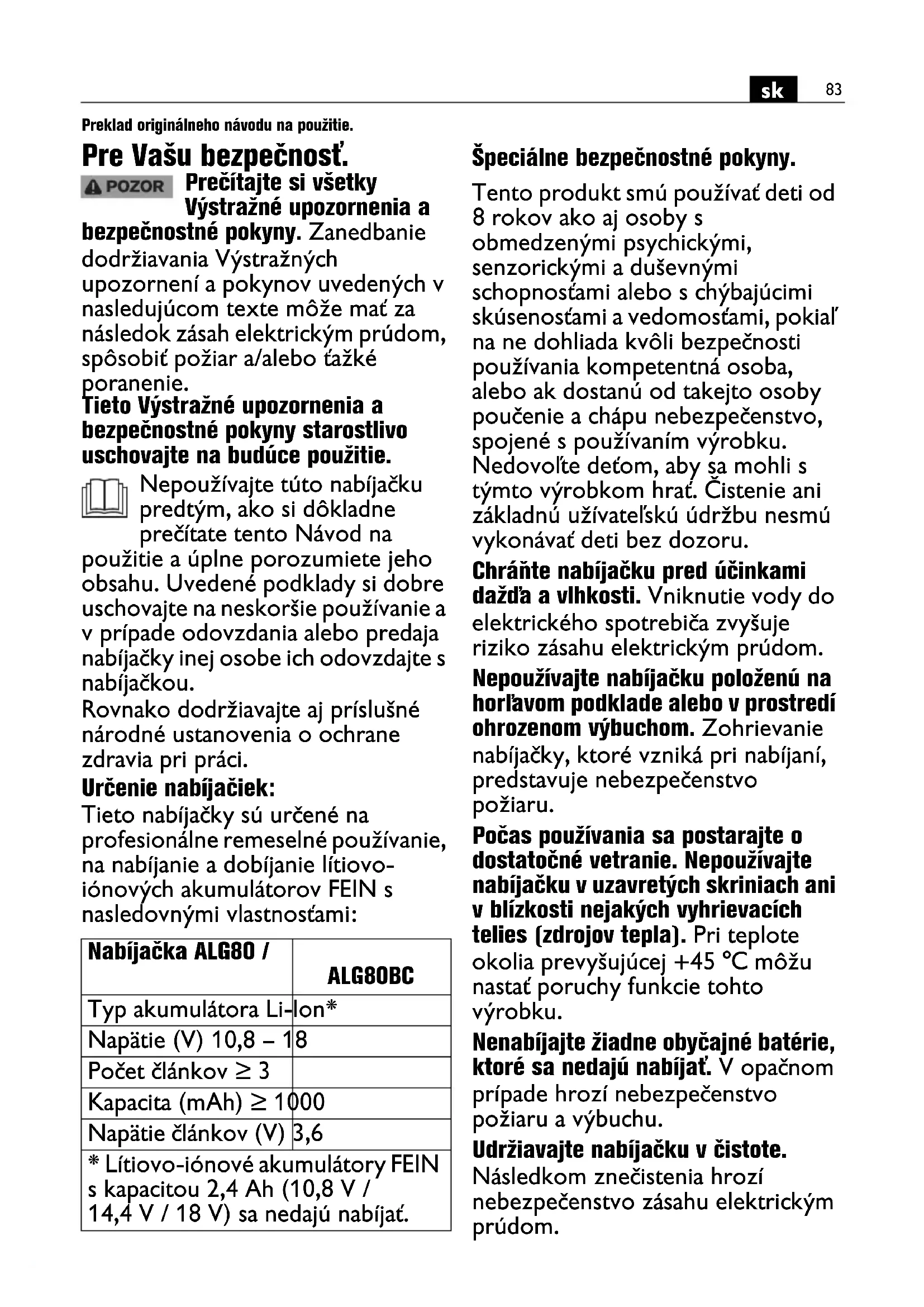 Preklad originálneho návodu na použitie. Pre Vašu bezpečnosť. Prečítajte si všetky Výstražné upozornenia a bezpečnostné pokyny. Zanedbanie dodržiavania Výstražných upozornení a pokynov uvedených v nasledujúcom texte môže mať za následok zásah elektrickým prúdom, spôsobiť požiar a/alebo ťažké poranenie. Tieto Výstražné upozornenia a bezpečnostné pokyny starostlivo uschovajte na budúce použitie. Nepoužívajte túto nabíjačku predtým, ako si dôkladne prečítate tento Návod na použitie a úplne porozumiete jeho obsahu. Uvedené podklady si dobre uschovajte na neskoršie používanie a v prípade odovzdania alebo predaja nabíjačky inej osobe ich odovzdajte s nabíjačkou. Rovnako dodržiavajte aj príslušné národné ustanovenia o ochrane zdravia pri práci. Určenie nabíjačiek: Tieto nabíjačky sú určené na profesionálne remeselné používanie, na nabíjanie a dobíjanie lítiovo- iónových akumulátorov FEIN s nasledovnými vlastnosťami: Špeciálne bezpečnostné pokyny. Tento produkt smú používať deti od 8 rokov ako aj osoby s obmedzenými psychickými, senzorickými a duševnými schopnosťami alebo s chýbajúcimi skúsenosťami a vedomosťami, pokiaľ na ne dohliada kvôli bezpečnosti používania kompetentná osoba, alebo ak dostanú od takejto osoby poučenie a chápu nebezpečenstvo, spojené s používaním výrobku. Nedovoľte deťom, aby sa mohli s týmto výrobkom hrať. Čistenie ani základnú užívateľskú údržbu nesmú vykonávať deti bez dozoru. Chráňte nabíjačku pred účinkami dažďa a vlhkosti. Vniknutie vody do elektrického spotrebiča zvyšuje riziko zásahu elektrickým prúdom. Nepoužívajte nabíjačku položenú na horľavom podklade alebo v prostredí ohrozenom výbuchom. Zohrievanie nabíjačky, ktoré vzniká pri nabíjaní, predstavuje nebezpečenstvo požiaru. Počas používania sa postarajte o dostatočné vetranie. Nepoužívajte nabíjačku v uzavretých skriniach ani v blízkosti nejakých vyhrievacích telies (zdrojov tepla). Pri teplote okolia prevyšujúcej +45 °C môžu nastať poruchy funkcie tohto výrobku. Nenabíjajte žiadne obyčajné batérie, ktoré sa nedajú nabíjať. V opačnom prípade hrozí nebezpečenstvo požiaru a výbuchu. Udržiavajte nabíjačku v čistote. Následkom znečistenia hrozí nebezpečenstvo zásahu elektrickým prúdom. Nabíjačka ALG80 / ALG80BC Typ akumulátora Li-Ion* Napätie (V) 10,8 – 18 Počet článkov ≥ 3 Kapacita (mAh) ≥ 1000 Napätie článkov (V) 3,6