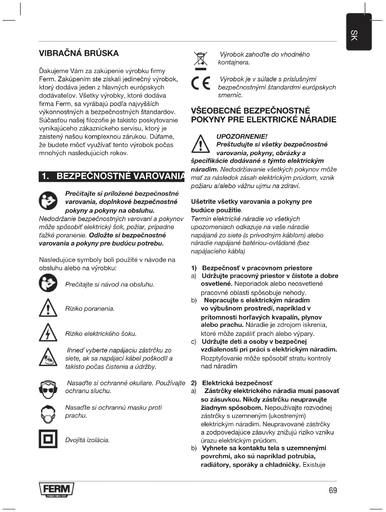 Prečítajte si priložené bezpečnostné varovania, doplnkové bezpečnostné pokyny a pokyny na obsluhu. Nedodržanie bezpečnostných varovaní a pokynov môže spôsobiť elektrický šok, požiar, prípadne ťažké poranenie. Odložte si bezpečnostné varovania a pokyny pre budúcu potrebu. Nasledujúce symboly boli použité v návode na obsluhu alebo na výrobku: Prečítajte si návod na obsluhu. Riziko poranenia. Riziko elektrického šoku. Ihneď vyberte napájaciu zástrčku zo siete, ak sa napájací kábel poškodil a takisto počas čistenia a údržby. Nasaďte si ochranné okuliare. Používajte ochranu sluchu. Nasaďte si ochrannú masku proti prachu. Dvojitá izolácia. Výrobok zahoďte do vhodného kontajnera. Výrobok je v súlade s príslušnými bezpečnostnými štandardmi európskych smerníc.