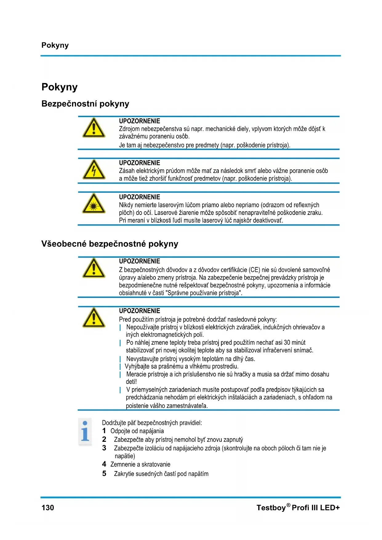 Profi III LED+ je na základe vysokého stupňa krytia (IP65) použiteľný aj v náročných podmienkach. Bezpečnostní pokyny Rozhodli ste sa pre prístroj, ktorý vám poskytne vysokú mieru bezpečnosti. Pre bezpečné a správne používanie prístroja je potrebné aby ste si pred jeho prvým použitím prečítali celý tento návod na obsluhu.Obsluha Testboy