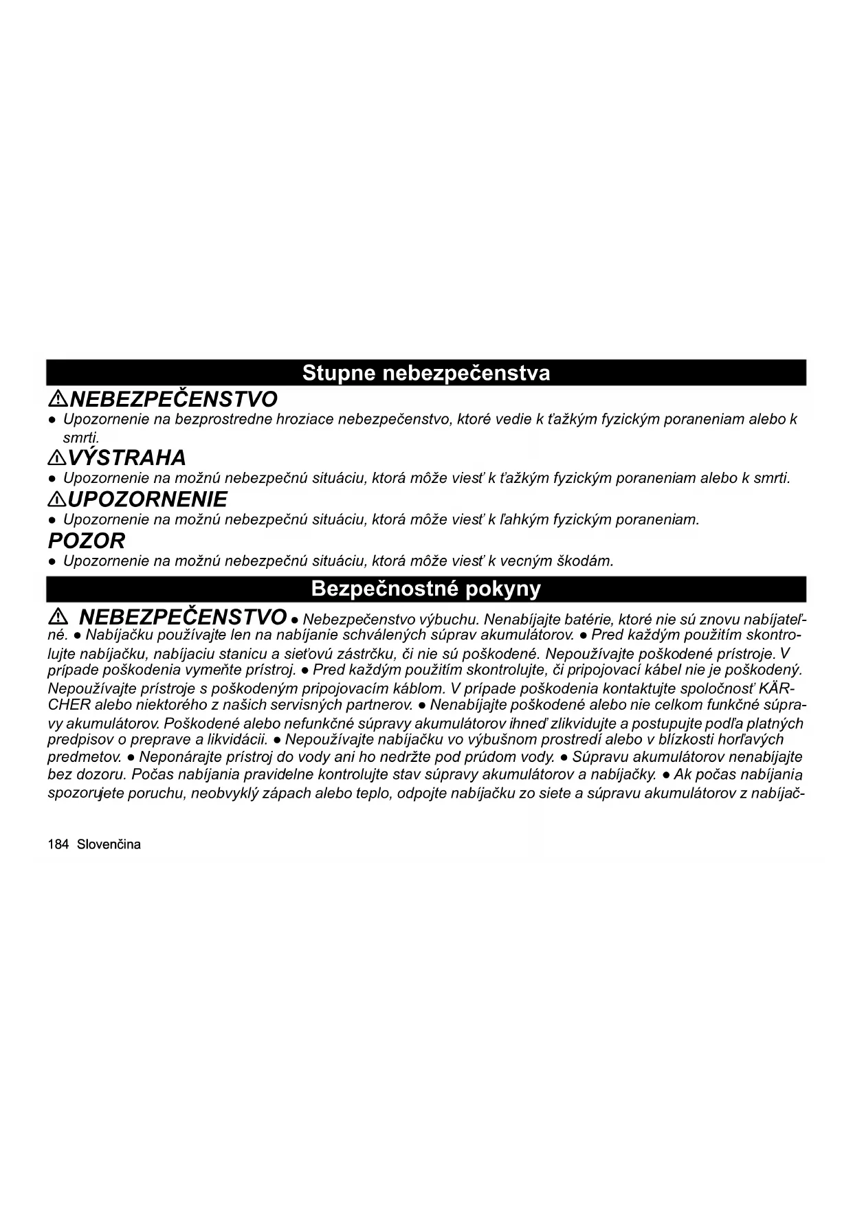 - Technické údaje 84 Slovenčina Stupne nebezpečenstva NEBEZPEČENSTVO ● Upozornenie na bezprostredne hroziace nebezpečenstvo, ktoré vedie k ťažkým fyzickým poraneniam alebo k smrti. 몇 VÝSTRAHA ● Upozornenie na možnú nebezpečnú situáciu, ktorá môže viesť k ťažkým fyzickým poraneniam alebo k smrti. 몇 UPOZORNENIE ● Upozornenie na možnú nebezpečnú situáciu, ktorá môže viesť k ľahkým fyzickým poraneniam. POZOR ● Upozornenie na možnú nebezpečnú situáciu, ktorá môže viesť k vecným škodám. Bezpečnostné pokyny NEBEZPEČENSTVO ● Nebezpečenstvo výbuchu. Nenabíjajte batérie, ktoré nie sú znovu nabíjateľ- né. ● Nabíjačku používajte len na nabíjanie schválených súprav akumulátorov. ● Pred každým použitím skontro- lujte nabíjačku, nabíjaciu stanicu a sieťovú zástrčku, či nie sú poškodené. Nepoužívajte poškodené prístroje. p. 1911