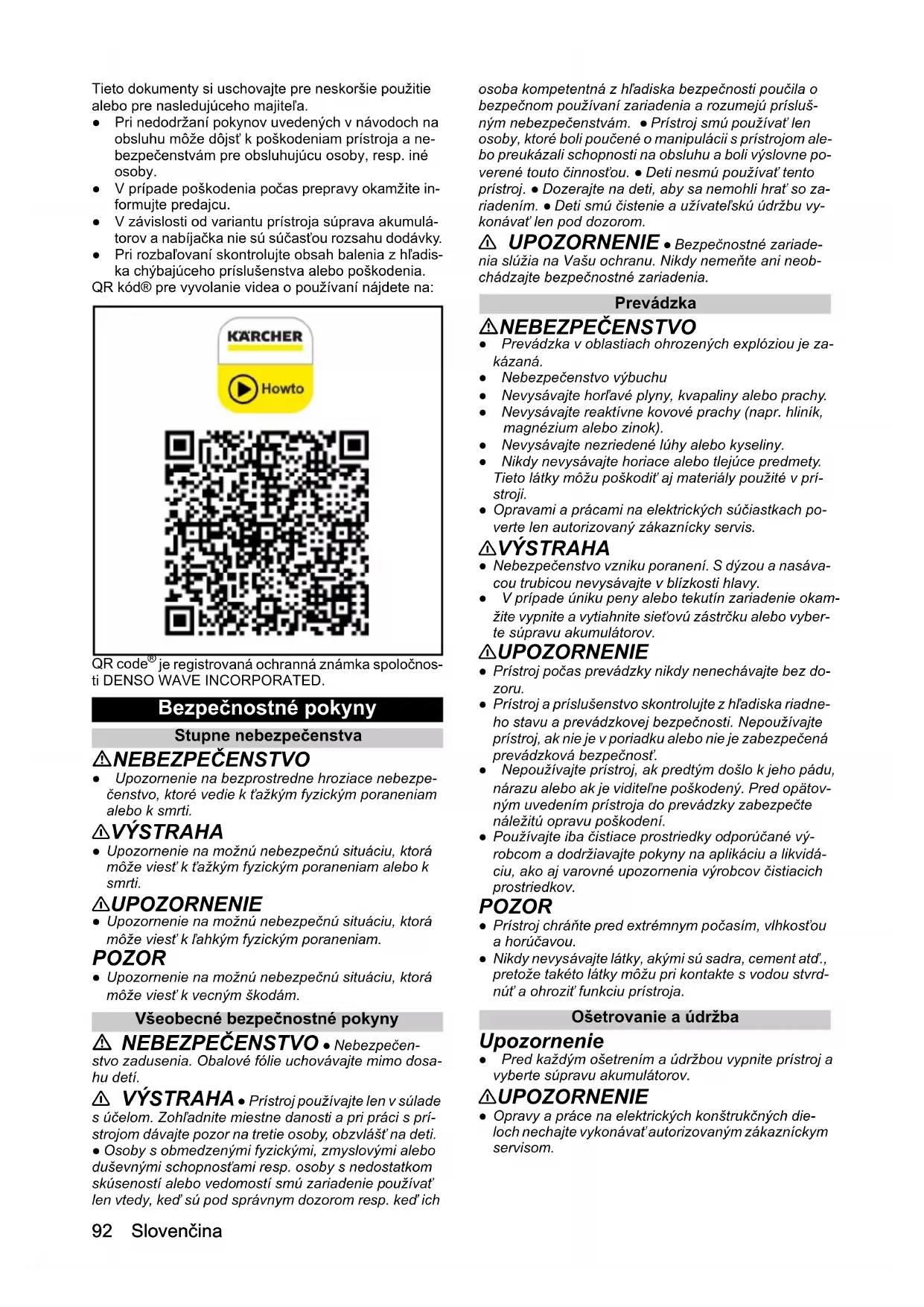 je registrovaná ochranná známka spoločnos- ti DENSO WAVE INCORPORATED. Bezpečnostné pokyny Stupne nebezpečenstva NEBEZPEČENSTVO ● Upozornenie na bezprostredne hroziace nebezpe- čenstvo, ktoré vedie k ťažkým fyzickým poraneniam alebo k smrti. 몇 VÝSTRAHA ● Upozornenie na možnú nebezpečnú situáciu, ktorá môže viesť k ťažkým fyzickým poraneniam alebo k smrti. 몇 UPOZORNENIE ● Upozornenie na možnú nebezpečnú situáciu, ktorá môže viesť k ľahkým fyzickým poraneniam. POZOR ● Upozornenie na možnú nebezpečnú situáciu, ktorá môže viesť k vecným škodám. Všeobecné bezpečnostné pokyny NEBEZPEČENSTVO ● Nebezpečen- stvo zadusenia. Obalové fólie uchovávajte mimo dosa- hu detí. 몇 VÝSTRAHA ● Prístroj používajte len v súlade s účelom. Zohľadnite miestne danosti a pri práci s prí- strojom dávajte pozor na tretie osoby, obzvlášť na deti. ● Osoby s obmedzenými fyzickými, zmyslovými alebo duševnými schopnosťami resp. osoby s nedostatkom skúseností alebo vedomostí smú zariadenie používať len vtedy, keď sú pod správnym dozorom resp. keď ich osoba kompetentná z hľadiska bezpečnosti poučila o bezpečnom používaní zariadenia a rozumejú prísluš- ným nebezpečenstvám. ● Prístroj smú používať len osoby, ktoré boli poučené o manipulácii s prístrojom ale- bo preukázali schopnosti na obsluhu a boli výslovne po- verené touto činnosťou. ● Deti nesmú používať tento prístroj. ● Dozerajte na deti, aby sa nemohli hrať so za- riadením. ● Deti smú čistenie a užívateľskú údržbu vy- konávať len pod dozorom. 몇 UPOZORNENIE ● Bezpečnostné zariade- nia slúžia na Vašu ochranu. Nikdy nemeňte ani neob- chádzajte bezpečnostné zariadenia. Prevádzka NEBEZPEČENSTVO ● Prevádzka v oblastiach ohrozených explóziou je za- kázaná. ● Nebezpečenstvo výbuchu ● Nevysávajte horľavé plyny, kvapaliny alebo prachy. ● Nevysávajte reaktívne kovové prachy (napr. hliník, magnézium alebo zinok). ● Nevysávajte nezriedené lúhy alebo kyseliny. ● Nikdy nevysávajte horiace alebo tlejúce predmety. Tieto látky môžu poškodiť aj materiály použité v prí- stroji. ● Opravami a prácami na elektrických súčiastkach po- verte len autorizovaný zákaznícky servis. 몇 VÝSTRAHA ● Nebezpečenstvo vzniku poranení. S dýzou a nasáva- cou trubicou nevysávajte v blízkosti hlavy. ● V prípade úniku peny alebo tekutín zariadenie okam- žite vypnite a vytiahnite sieťovú zástrčku alebo vyber- te súpravu akumulátorov. 몇 UPOZORNENIE ● Prístroj počas prevádzky nikdy nenechávajte bez do- zoru. ● Prístroj a príslušenstvo skontrolujte z hľadiska riadne- ho stavu a prevádzkovej bezpečnosti. Nepoužívajte prístroj, ak nie je v poriadku alebo nie je zabezpečená prevádzková bezpečnosť. ● Nepoužívajte prístroj, ak predtým došlo k jeho pádu, nárazu alebo ak je viditeľne poškodený. Pred opätov- ným uvedením prístroja do prevádzky zabezpečte náležitú opravu poškodení. ● Používajte iba čistiace prostriedky odporúčané vý- robcom a dodržiavajte pokyny na aplikáciu a likvidá- ciu, ako aj varovné upozornenia výrobcov čistiacich prostriedkov. POZOR ● Prístroj chráňte pred extrémnym počasím, vlhkosťou a horúčavou. ● Nikdy nevysávajte látky, akými sú sadra, cement atď., pretože takéto látky môžu pri kontakte s vodou stvrd- núť a ohroziť funkciu prístroja. Ošetrovanie a údržba Upozornenie ● Pred každým ošetrením a údržbou vypnite prístroj a vyberte súpravu akumulátorov. 몇 UPOZORNENIE ● Opravy a práce na elektrických konštrukčných die- loch nechajte vykonávať autorizovaným zákazníckym servisom.Slovenčina 93 몇 VÝSTRAHA ● Zariadenie obsahuje elektrické konštrukčné diely, a