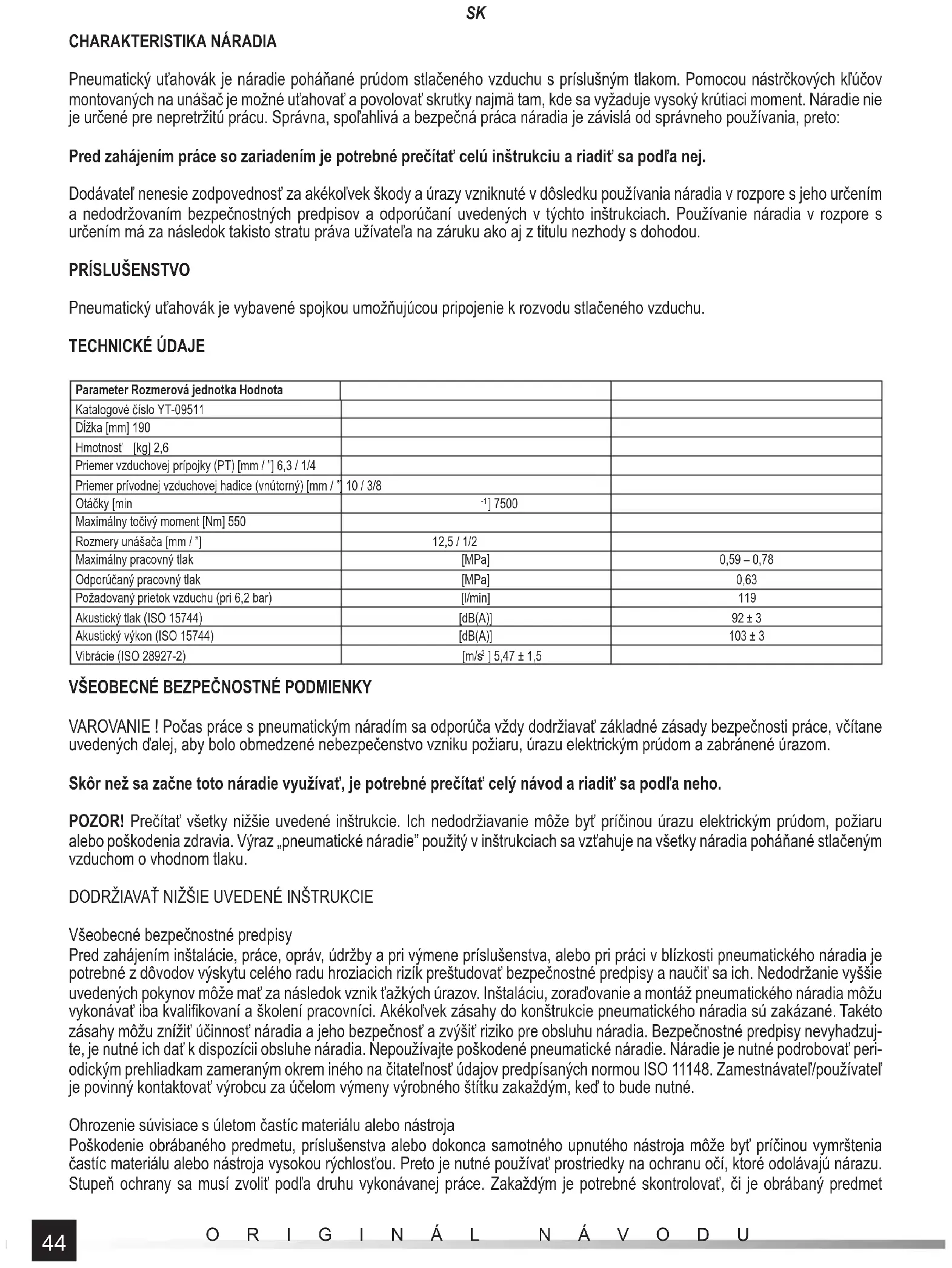 VAROVANIE ! Počas práce s pneumatickým náradím sa odporúča vždy dodržiavať základné zásady bezpečnosti práce, včítane uvedených ďalej, aby bolo obmedzené nebezpečenstvo vzniku požiaru, úrazu elektrickým prúdom a zabránené úrazom. Skôr než sa začne toto náradie využívať, je potrebné prečítať celý návod a riadiť sa podľa neho. POZOR! Prečítať všetky nižšie uvedené inštrukcie. Ich nedodržiavanie môže byť príčinou úrazu elektrickým prúdom, požiaru alebo poškodenia zdravia. Výraz „pneumatické náradie” použitý v inštrukciach sa vzťahuje na všetky náradia poháňané stlačeným vzduchom o vhodnom tlaku. DODRŽIAVAŤ NIŽŠIE UVEDENÉ INŠTRUKCIE Všeobecné bezpečnostné predpisy Pred zahájením inštalácie, práce, opráv, údržby a pri výmene príslušenstva, alebo pri práci v blízkosti pneumatického náradia je potrebné z dôvodov výskytu celého radu hroziacich rizík preštudovať bezpečnostné predpisy a naučiť sa ich. Nedodržanie vyššie uvedených pokynov môže mať za následok vznik ťažkých úrazov. Inštaláciu, zoraďovanie a montáž pneumatického náradia môžu vykonávať iba kvalifi kovaní a školení pracovníci. Akékoľvek zásahy do konštrukcie pneumatického náradia sú zakázané. Takéto zásahy môžu znížiť účinnosť náradia a jeho bezpečnosť a zvýšiť riziko pre obsluhu náradia. Bezpečnostné predpisy nevyhadzuj- te, je nutné ich dať k dispozícii obsluhe náradia. Nepoužívajte poškodené pneumatické náradie. Náradie je nutné podrobovať peri- odickým prehliadkam zameraným okrem iného na čitateľnosť údajov predpísaných normou ISO 11148. Zamestnávateľ/používateľ je povinný kontaktovať výrobcu za účelom výmeny výrobného štítku zakaždým, keď to bude nutné. Ohrozenie súvisiace s úletom častíc materiálu alebo nástroja Poškodenie obrábaného predmetu, príslušenstva alebo dokonca samotného upnutého nástroja môže byť príčinou vymrštenia častíc materiálu alebo nástroja vysokou rýchlosťou. Preto je nutné používať prostriedky na ochranu očí, ktoré odolávajú nárazu. Stupeň ochrany sa musí zvoliť podľa druhu vykonávanej práce. Zakaždým je potrebné skontrolovať, či je obrábaný predmet45