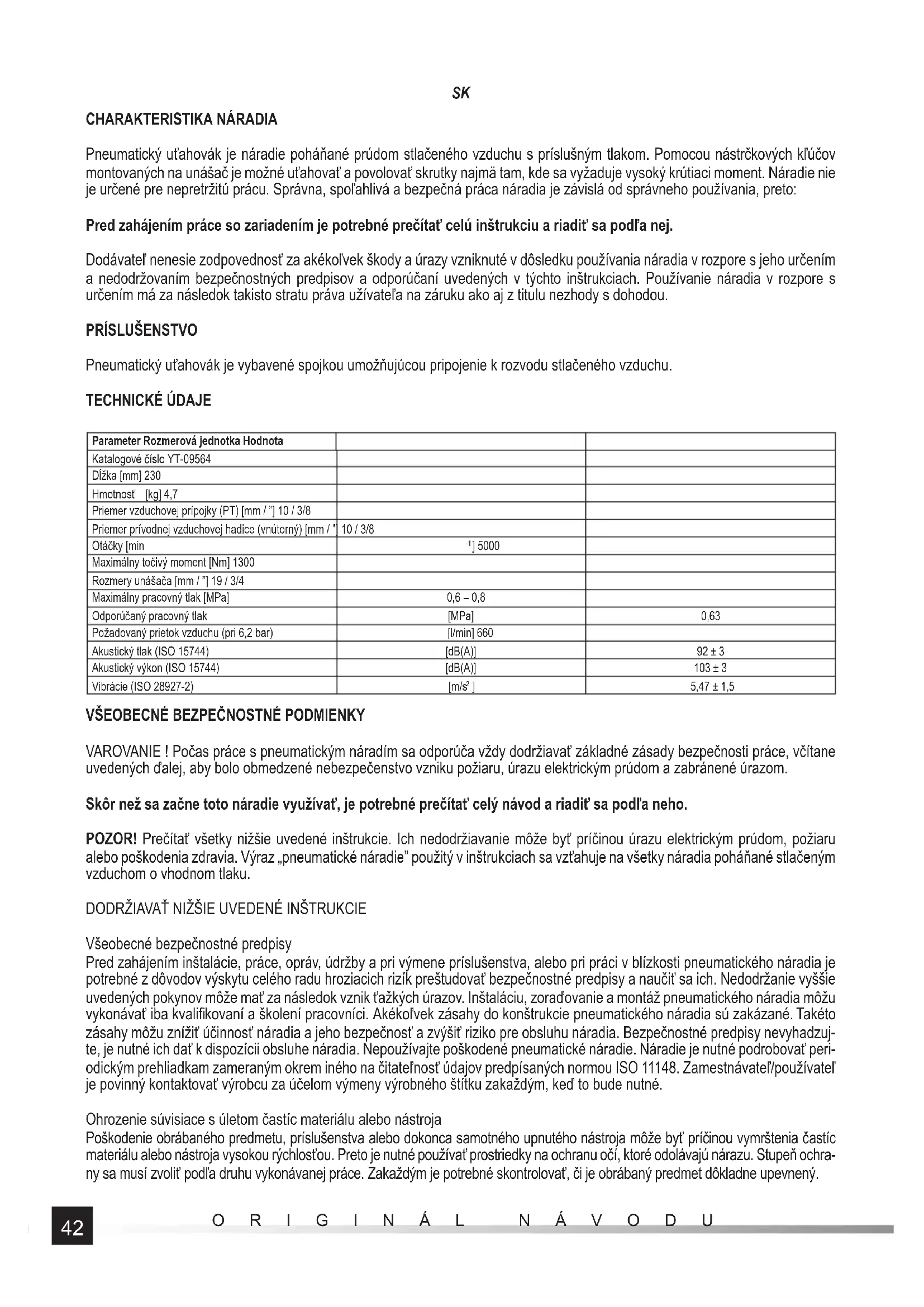 Pneumatický uťahovák je náradie poháňané prúdom stlačeného vzduchu s príslušným tlakom. Pomocou nástrčkových kľúčov montovaných na unášač je možné uťahovať a povolovať skrutky najmä tam, kde sa vyžaduje vysoký krútiaci moment. Náradie nie je určené pre nepretržitú prácu. Správna, spoľahlivá a bezpečná práca náradia je závislá od správneho používania, preto: Pred zahájením práce so zariadením je potrebné prečítať celú inštrukciu a riadiť sa podľa nej. Dodávateľ nenesie zodpovednosť za akékoľvek škody a úrazy vzniknuté v dôsledku používania náradia v rozpore s jeho určením a nedodržovaním bezpečnostných predpisov a odporúčaní uvedených v týchto inštrukciach. Používanie náradia v rozpore s určením má za následok takisto stratu práva užívateľa na záruku ako aj z titulu nezhody s dohodou.