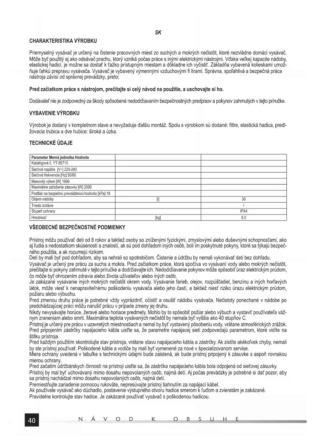 Výrobok je dodaný v kompletnom stave a nevyžaduje ďalšiu montáž. Spolu s výrobkom sú dodané: fi ltre, elastická hadica, predl- žovacia trubica a dve hubice: široká a úzka. TECHNICKÉ ÚDAJE Parameter Merná jednotka Hodnota Katalógové č. YT-85715 Sieťové napätie [V~] 220-240 Sieťová frekvencia [Hz] 50/60 Menovitý výkon [W] 1600 Maximálne zaťaženie zásuvky [W] 2000 Podtlak na bezpečnú prevádzkovú hodnotu [kPa] 18 Objem nádoby [l] 30 Trieda izolácie I Stupeň ochrany IPX4 Hmotnosť [kg] 8,0