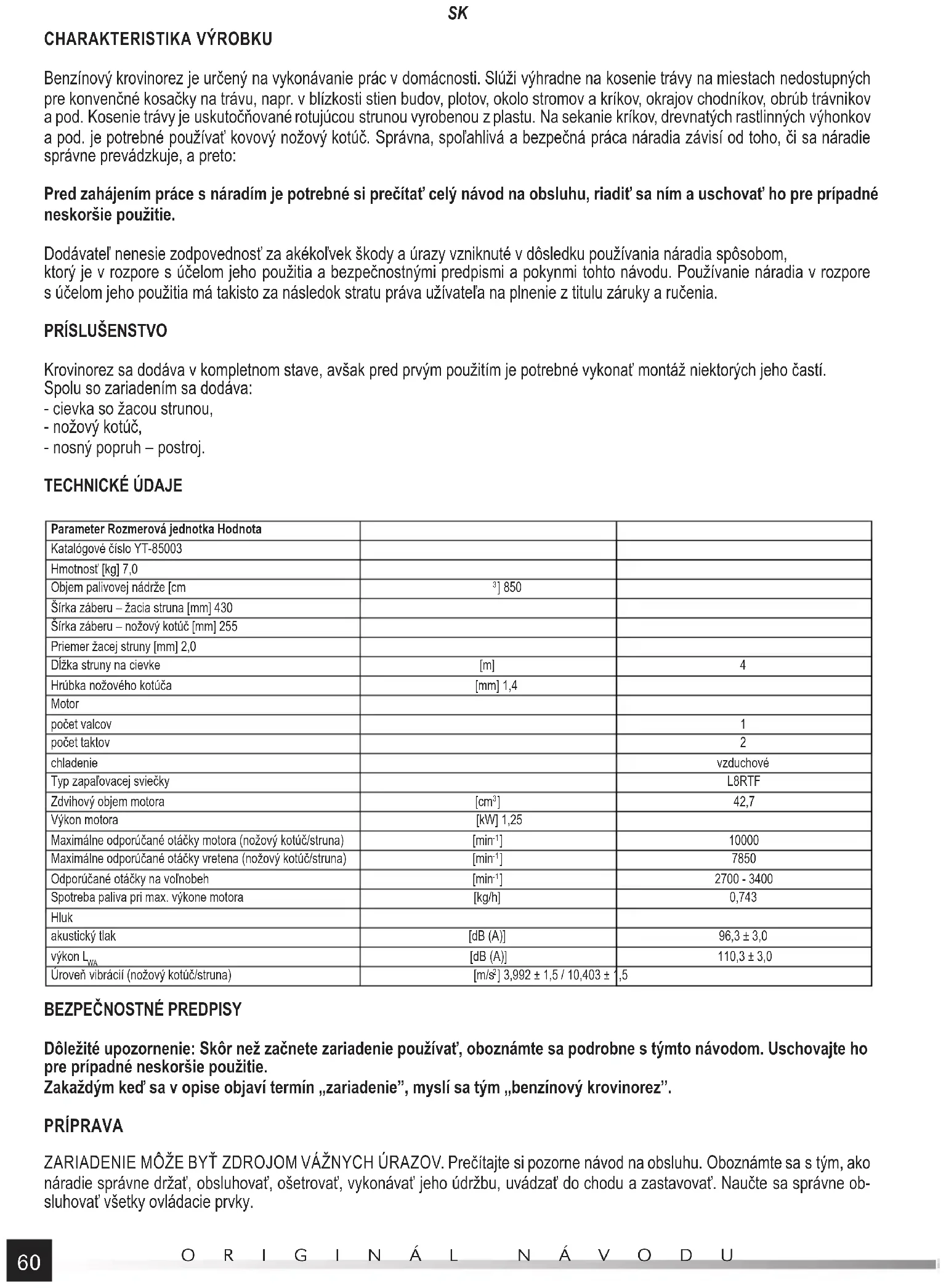 Krovinorez sa dodáva v kompletnom stave, avšak pred prvým použitím je potrebné vykonať montáž niektorých jeho častí. Spolu so zariadením sa dodáva: - cievka so žacou strunou, - nožový kotúč, - nosný popruh – postroj. TECHNICKÉ ÚDAJE Parameter Rozmerová jednotka Hodnota Katalógové číslo YT-85003 Hmotnosť [kg] 7,0 Objem palivovej nádrže [cm