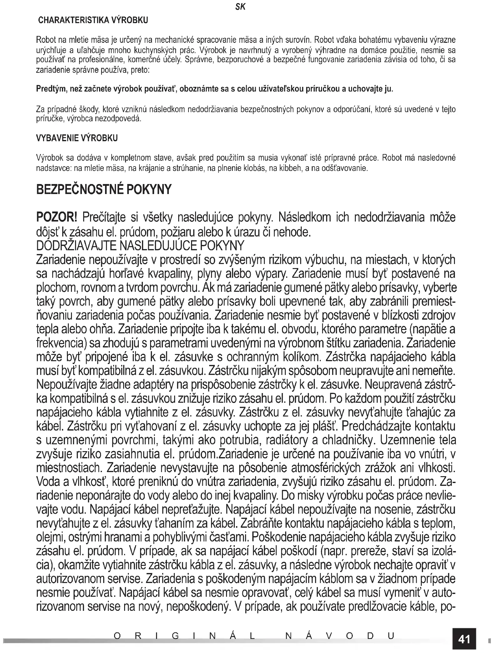 užívajte predlžovacie káble ktorých parametre sa zhodujú s parametrami, ktoré sú uvedené na výrobnom štítku zariadenia. Prierez vodičov predlžovacieho kábla nesmie byť menší než prierez vodičov napájacieho kábla zariadenia. Tieto parametre skontrolujte na izolácii na- pájacieho a predlžovacieho kábla, v prípade pochybností sa obráťte na výrobcu zariadenia a/alebo predlžovacieho kábla. Výrobok v žiadnom prípade nepoužívajte, ak je akákoľvek jeho časť poškodená alebo ak je poškodená akákoľvek časť príslušenstva. V prípade, ak objavíte akékoľvek poškodenie ktorejkoľvek časti zariadenia, zariadenie v žiadnom prípa- de ďalej nepoužívajte. Zariadenie v takom prípade odovzdajte do autorizovaného servisu alebo daný diel vymeňte samostatne, ak je v používateľskej príručke taká oprava povolená. Predtým, než začnete vykonávať akékoľvek činnosti súvisiace s výmenou, čistením alebo nastavovaním pohyblivých častí, zariadenie vypnite, a zástrčku napájacieho kábla vytiahnite z el. zásuvky. Zariadenie môžu používať deti vo veku od 8 rokov, ako aj osoby s obme- dzenými fyzickými a rozumovými schopnosťami, ako aj osoby, ktoré nemajú dostatočné vedomosti a skúsenosti, ak budú pod neustálym dohľadom, alebo ak boli predtým prí- slušne zaškolené o spôsobe používania zariadenia bezpečným spôsobom, a pochopili riziká, ktoré s používaním tohto zariadenia súvisia. Deti sa so zariadením v žiadnom prípade nesmú hrať. Deti bez dozoru dospelej osoby nesmú zariadenie čistiť, ani vyko- návať jeho údržbu.Zariadenie je určené iba na domáce používanie. Odporúčame, aby ste nepresahovali 2 minúty neustálej práce, zariadenie po uplynutí tohto času nepoužívajte cca 20 minút, aby dostatočne vychladlo. Počas prestávky vytiahnite zástrčku napájacieho kábla z el. zásuvky. Maximálne trvanie neustálej práce by nemalo prekro čiť 10 minút, zariade- nie po uplynutí tohto času vypnite a nechajte ďalších 10 minút samočinne vychladnúť. Výrobok nepreťažujte, v opačnom prípade sa rýchlejšie opotrebuje, a tiež môže dôjsť k poškodeniu výrobku. Robot na mletie nepoužívajte na mletie tvrdých častí potravín. Mäso na mletie náležite pripravte, odstráňte kožu, kosti a chrupavky. Iné potraviny tiež náležite pri- pravte na mletie, tzn. odstráňte kôstky, tvrdé stonky, škrupiny a ulity, a všetky iné tvrdé časti. Tiež nemeľte zamrazené potraviny.