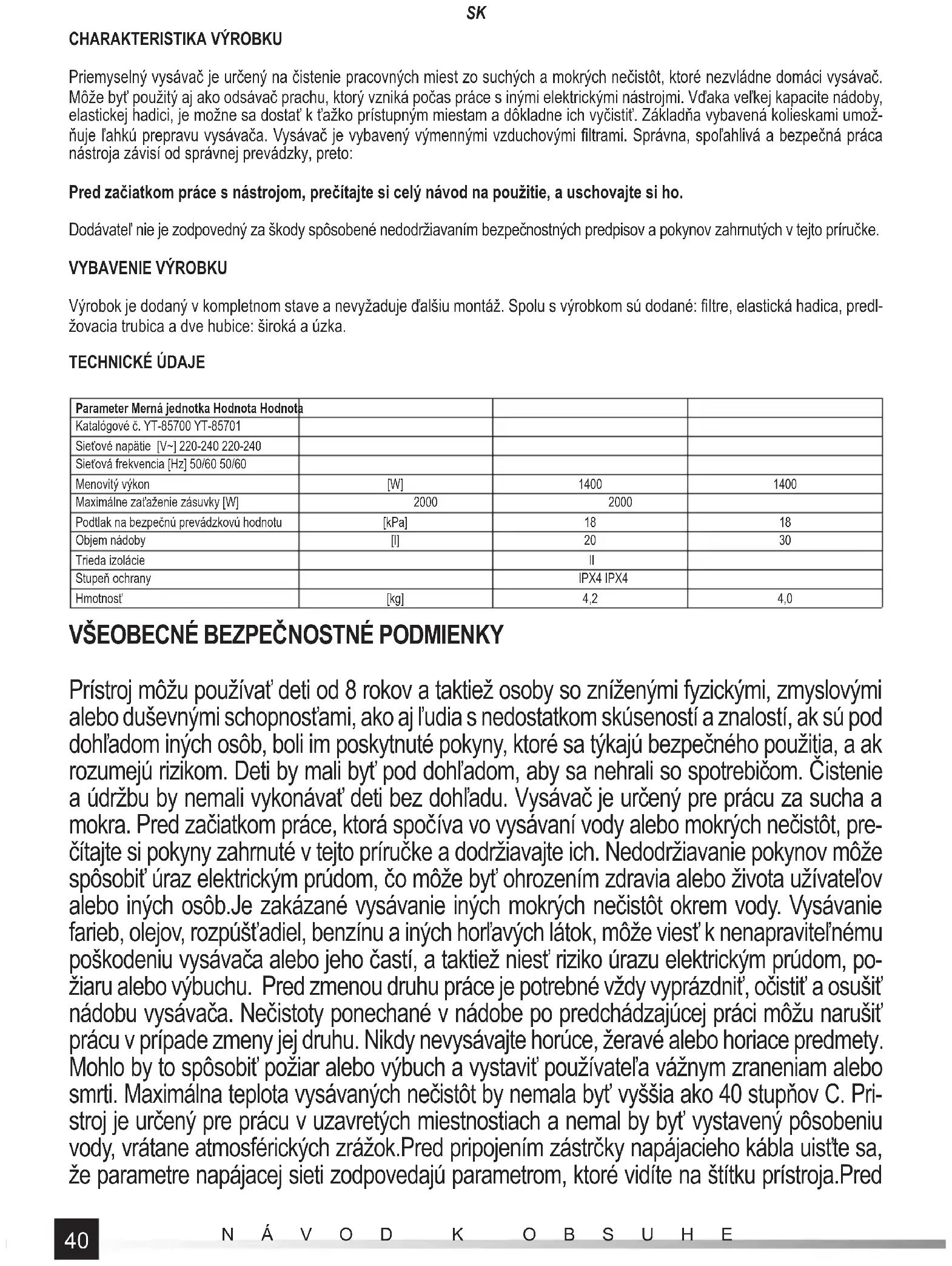 Prístroj môžu používať deti od 8 rokov a taktiež osoby so zníženými fyzickými, zmyslovými alebo duševnými schopnosťami, ako aj ľudia s nedostatkom skúseností a znalostí, ak sú pod dohľadom iných osôb, boli im poskytnuté pokyny, ktoré sa týkajú bezpečného použitia, a ak rozumejú rizikom. Deti by mali byť pod dohľadom, aby sa nehrali so spotrebičom. Čistenie a údržbu by nemali vykonávať deti bez dohľadu. Vysávač je určený pre prácu za sucha a mokra. Pred začiatkom práce, ktorá spočíva vo vysávaní vody alebo mokrých nečistôt, pre- čítajte si pokyny zahrnuté v tejto príručke a dodržiavajte ich. Nedodržiavanie pokynov môže spôsobiť úraz elektrickým prúdom, čo môže byť ohrozením zdravia alebo života užívateľov alebo iných osôb.Je zakázané vysávanie iných mokrých nečistôt okrem vody. Vysávanie farieb, olejov, rozpúšťadiel, benzínu a iných horľavých látok, môže viesť k nenapraviteľnému poškodeniu vysávača alebo jeho častí, a taktiež niesť riziko úrazu elektrickým prúdom, po- žiaru alebo výbuchu. Pred zmenou druhu práce je potrebné vždy vyprázdniť, očistiť a osušiť nádobu vysávača. Nečistoty ponechané v nádobe po predchádzajúcej práci môžu narušiť prácu v prípade zmeny jej druhu. Nikdy nevysávajte horúce, žeravé alebo horiace predmety. Mohlo by to spôsobiť požiar alebo výbuch a vystaviť používateľa vážnym zraneniam alebo smrti. Maximálna teplota vysávaných nečistôt by nemala byť vyššia ako 40 stupňov C. Pri- stroj je určený pre prácu v uzavretých miestnostiach a nemal by byť vystavený pôsobeniu vody, vrátane atmosférických zrážok.Pred pripojením zástrčky napájacieho kábla uisťte sa, že parametre napájacej sieti zodpovedajú parametrom, ktoré vidíte na štítku prístroja.Pred41