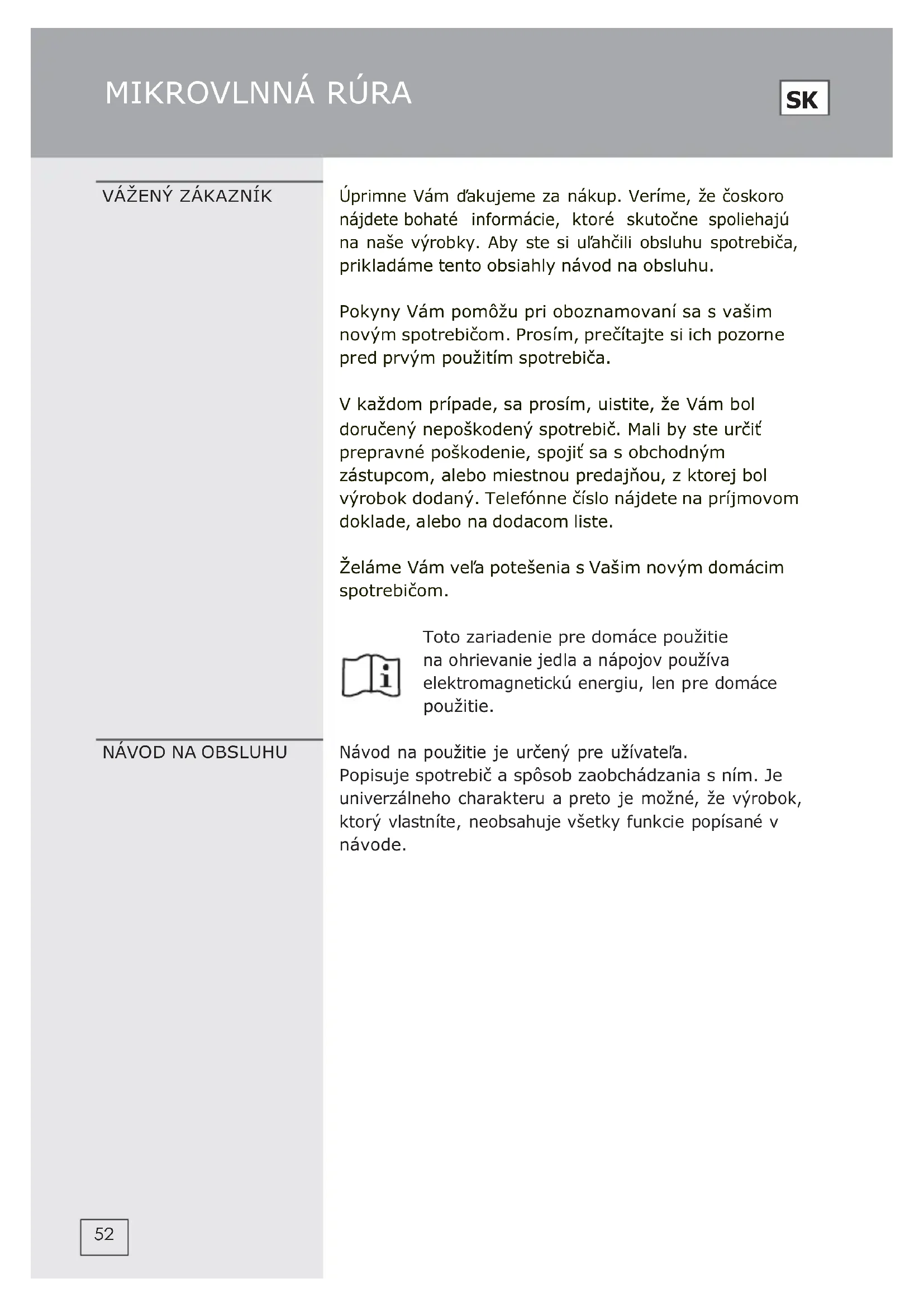 Úprimne Vám ďakujeme za nákup. Veríme, že čoskoro nájdete bohaté informácie, ktoré skutočne spoliehajú na naše výrobky. Aby ste si uľahčili obsluhu spotrebiča, prikladáme tento obsiahly návod na obsluhu. Pokyny Vám pomôžu pri oboznamovaní sa s vašim novým spotrebičom. Prosím, prečítajte si ich pozorne pred prvým použitím spotrebiča. V každom prípade, sa prosím, uistite, že Vám bol doručený nepoškodený spotrebič. Mali by ste určiť prepravné poškodenie, spojiť sa s obchodným zástupcom, alebo miestnou predajňou, z ktorej bol výrobok dodaný. Telefónne číslo nájdete na príjmovom doklade, alebo na dodacom liste. Želáme Vám veľa potešenia s Vašim novým domácim spotrebičom. Toto zariadenie pre domáce použitie na ohrievanie jedla a nápojov používa elektromagnetickú energiu, len pre domáce použitie.