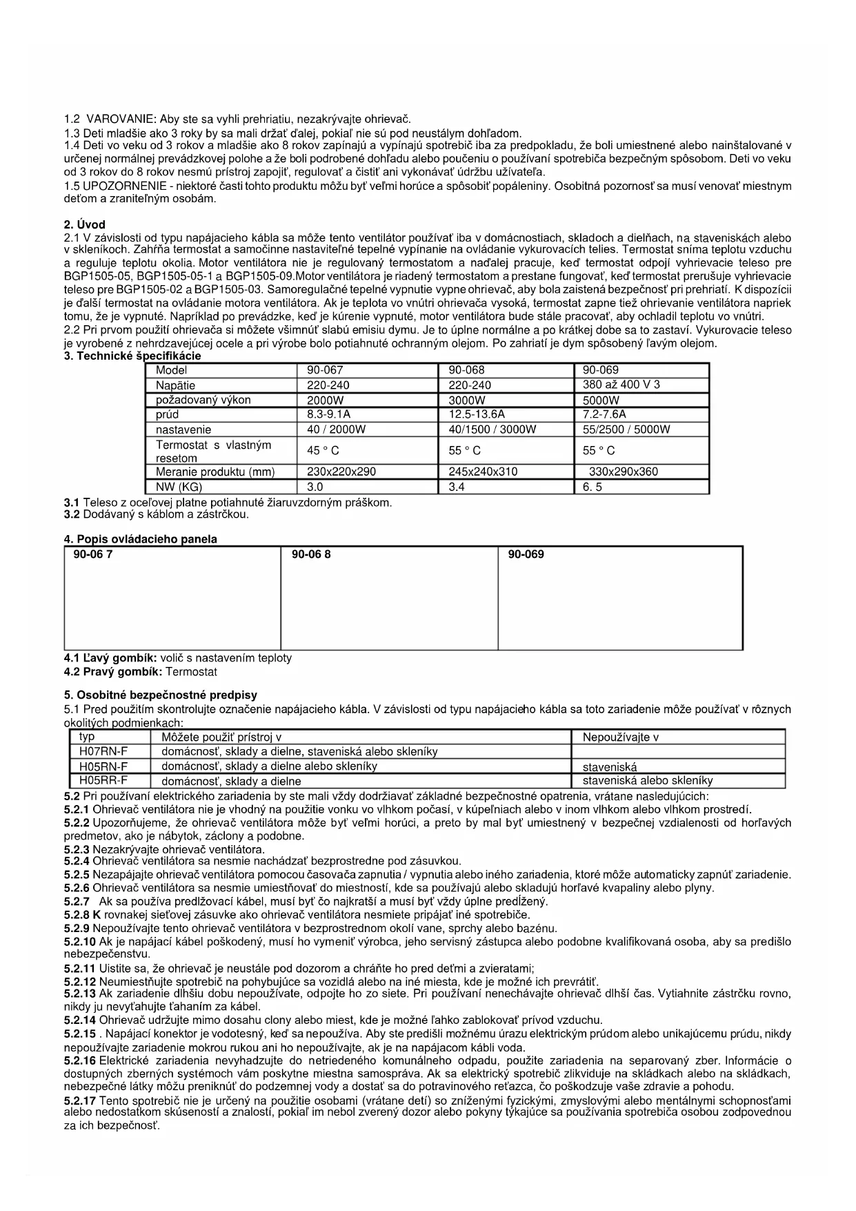 H05RN-F domácnosť, sklady a dielne alebo skleníky staveniská H05RR-F domácnosť, sklady a dielne staveniská alebo skleníky 5.2 Pri používaní elektrického zariadenia by ste mali vždy dodržiavať základné bezpečnostné opatrenia, vrátane nasledujúcich: 5.2.1 Ohrievač ventilátora nie je vhodný na použitie vonku vo vlhkom počasí, v kúpeľniach alebo v inom vlhkom alebo vlhkom prostredí. 5.2.2 Upozorňujeme, že ohrievač ventilátora môže byť veľmi horúci, a preto by mal byť umiestnený v bezpečnej vzdialenosti od horľavých predmetov, ako je nábytok, záclony a podobne.