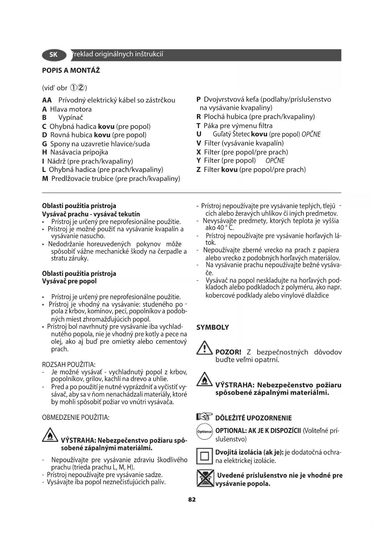 (Voliteľné prí- slušenstvo) Dvojitá izolácia (ak je): je dodatočná ochra- na elektrickej izolácie. Uvedené príslušenstvo nie je vhodné pre vysávanie popola. Preklad originálnych inštrukcií