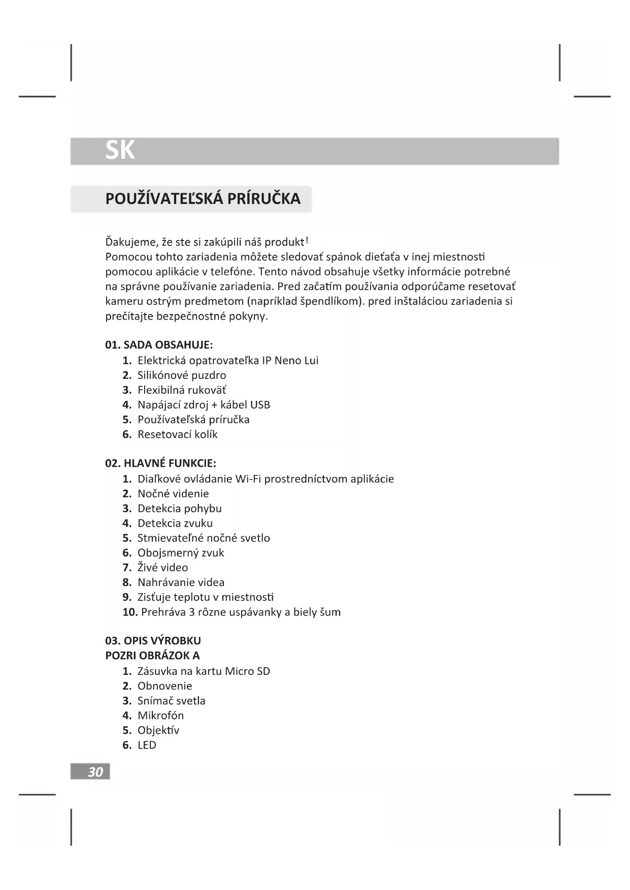 Pomocou tohto zariadenia môžete sledovať spánok dieťaťa v inej miestnos pomocou aplikácie v telefóne. Tento návod obsahuje všetky informácie potrebné na správne používanie zariadenia. Pred začam používania odporúčame resetovať kameru ostrým predmetom (napríklad špendlíkom). pred inštaláciou zariadenia si prečítajte bezpečnostné pokyny.