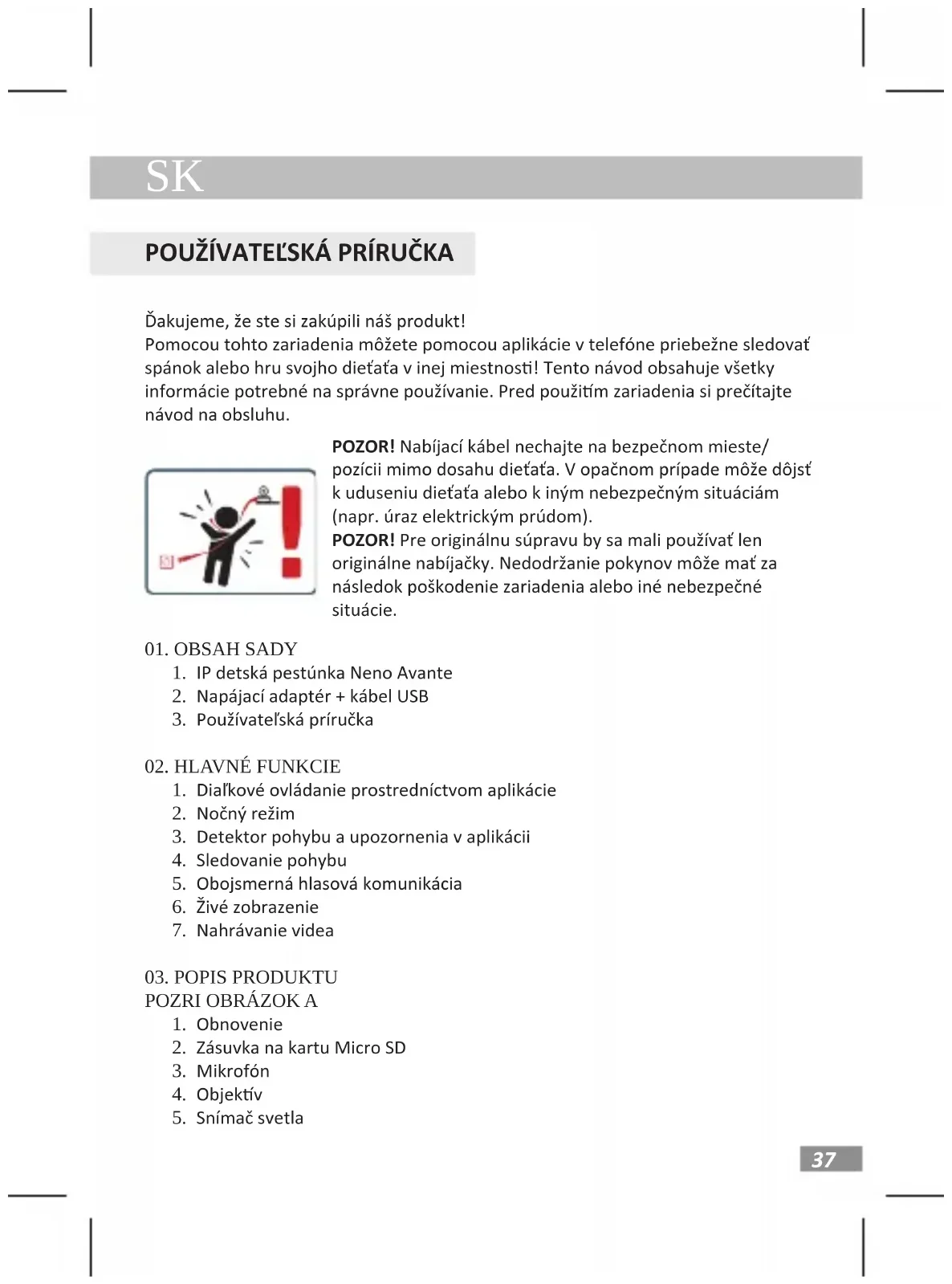 Ďakujeme, že ste si zakúpili náš produkt! Pomocou tohto zariadenia môžete pomocou aplikácie v telefóne priebežne sledovať spánok alebo hru svojho dieťaťa v inej miestnos! Tento návod obsahuje všetky informácie potrebné na správne používanie. Pred použim zariadenia si prečítajte návod na obsluhu. POZOR! Nabíjací kábel nechajte na bezpečnom mieste/ pozícii mimo dosahu dieťaťa. V opačnom prípade môže dôjsť k uduseniu dieťaťa alebo k iným nebezpečným situáciám (napr. úraz elektrickým prúdom). POZOR! Pre originálnu súpravu by sa mali používať len originálne nabíjačky. Nedodržanie pokynov môže mať za následok poškodenie zariadenia alebo iné nebezpečné situácie.