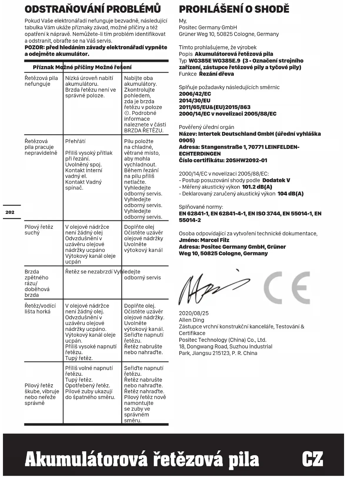 My, Positec Germany GmbH Grüner Weg 10, 50825 Cologne, Germany Vyhlasujeme, že tento výrobok Popis Akumulátorová reťazová píla Typ WG385E WG385E.9 (3 - Označenie strojového zariadenia, zástupcu reťazovej píly) Funkcia Rezanie dreva Zodpovedá nasledujúcim smerniciam: 2006/42/EC 2014/30/EU 2011/65/EU&(EU)2015/863 2000/14/EC v novelizácii 2005/88/EC Poverený úradný orgán Názov: Intertek Deutschland GmbH (úradná vyhláška 0905) Adresa: Stangenstraße 1, 70771 LEINFELDEN- ECHTERDINGEN Číslo certifikátu: 20SHW2092-01 2000/14/EC v novelizácii 2005/88/EC: - Postup vyhodnotenia zhody podľa Dodatku V - Meraný akustický výkon 101.2 dB(A) - Deklarovaný zaručený akustický výkon 104 dB(A) Spĺňa posudzované normy: EN 62841-1, EN 62841-4-1, EN ISO 3744, EN 55014-1, EN 55014-2 Osoba zodpovedajúca za technickú dokumentáciu: Názov: Marcel Filz Adresa: Positec Germany GmbH, Grüner Weg 10, 50825 Cologne, Germany 2020/08/25 Allen Ding Zástupca vrchnej konštrukčnej kancelárie,Testovanie & Certifikácia Positec Technology (China) Co., Ltd. 18, Dongwang Road, Suzhou Industrial Park, Jiangsu 215123, P. R. China VARNOST IZDELKA