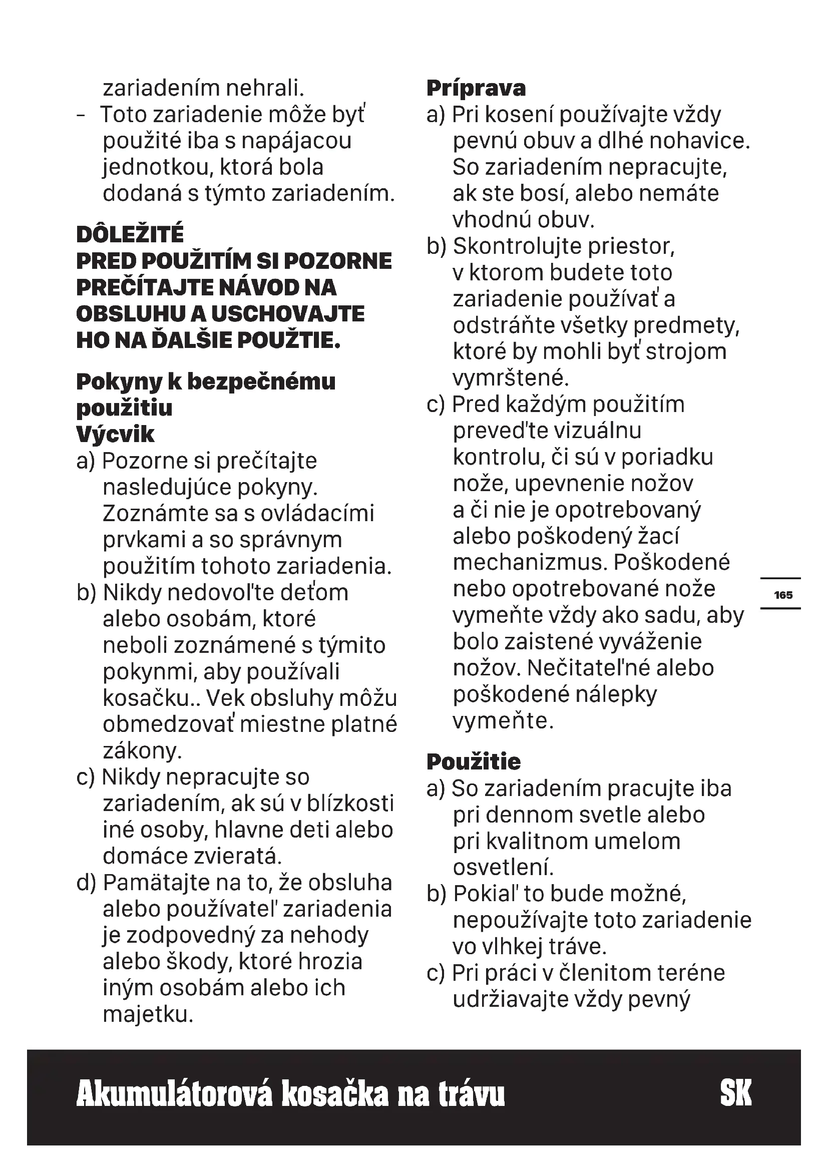 HO NA ĎALŠIE POUŽTIE. Pokyny k bezpečnému použitiu Výcvik a) Pozorne si prečítajte nasledujúce pokyny. Zoznámte sa s ovládacími prvkami a so správnym použitím tohoto zariadenia. b) Nikdy nedovoľte deťom alebo osobám, ktoré neboli zoznámené s týmito pokynmi, aby používali kosačku.. Vek obsluhy môžu obmedzovať miestne platné zákony. c) Nikdy nepracujte so zariadením, ak sú v blízkosti iné osoby, hlavne deti alebo domáce zvieratá. d) Pamätajte na to, že obsluha alebo používateľ zariadenia je zodpovedný za nehody alebo škody, ktoré hrozia iným osobám alebo ich majetku. Príprava a) Pri kosení používajte vždy pevnú obuv a dlhé nohavice. So zariadením nepracujte, ak ste bosí, alebo nemáte vhodnú obuv. b) Skontrolujte priestor, v ktorom budete toto zariadenie používať a odstráňte všetky predmety, ktoré by mohli byť strojom vymrštené. c) Pred každým použitím preveďte vizuálnu kontrolu, či sú v poriadku nože, upevnenie nožov a či nie je opotrebovaný alebo poškodený žací mechanizmus. Poškodené nebo opotrebované nože vymeňte vždy ako sadu, aby bolo zaistené vyváženie nožov. Nečitateľné alebo poškodené nálepky vymeňte. Použitie a) So zariadením pracujte iba pri dennom svetle alebo pri kvalitnom umelom osvetlení. b) Pokiaľ to bude možné, nepoužívajte toto zariadenie vo vlhkej tráve. c) Pri práci v členitom teréne udržiavajte vždy pevný166 $NXPXOiWRURYiNRVDĀNDQDWUiYX