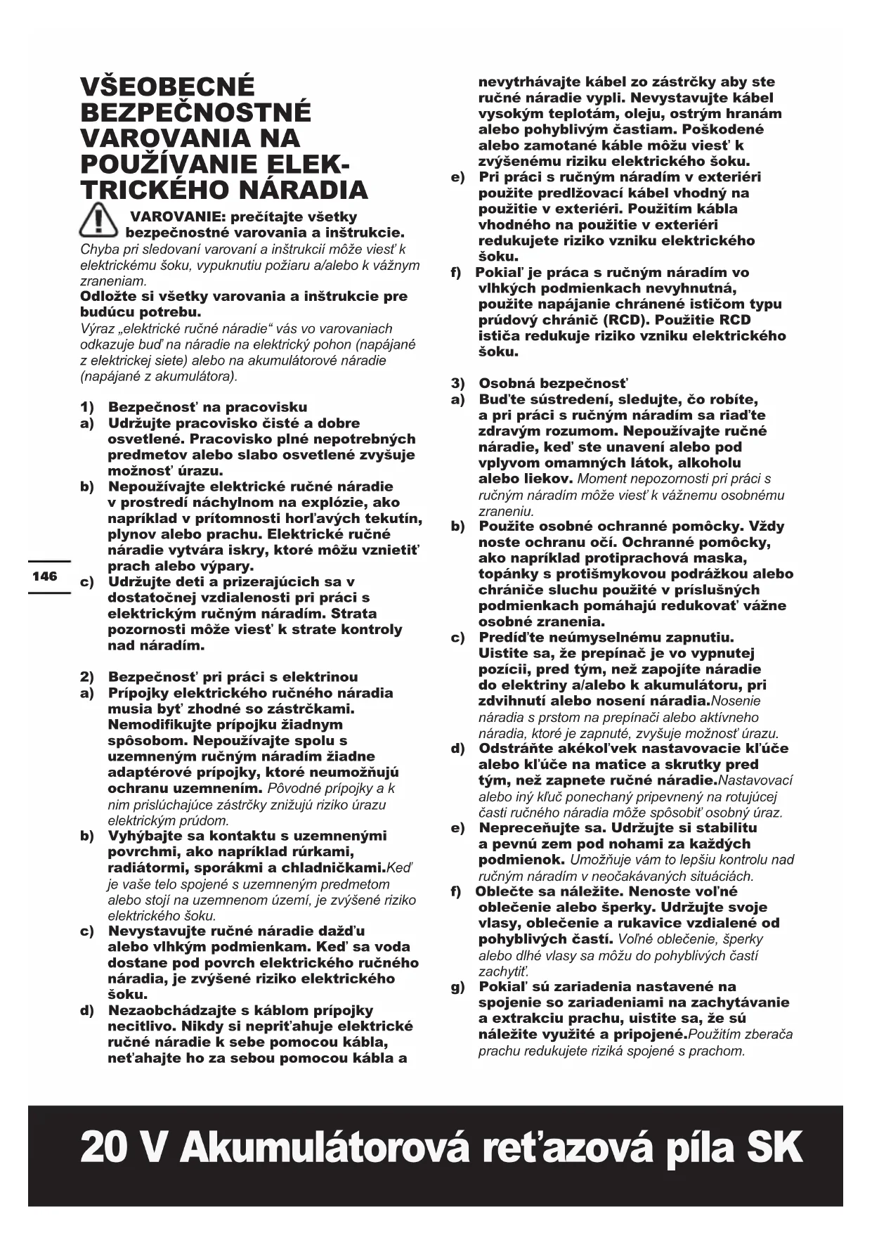 a) Buďte sústredení, sledujte, čo robíte, a pri práci s ručným náradím sa riaďte zdravým rozumom. Nepoužívajte ručné náradie, keď ste unavení alebo pod vplyvom omamných látok, alkoholu alebo liekov. Moment nepozornosti pri práci s ručným náradím môže viesť k vážnemu osobnému zraneniu. b) Použite osobné ochranné pomôcky. Vždy noste ochranu očí. Ochranné pomôcky, ako napríklad protiprachová maska, topánky s protišmykovou podrážkou alebo chrániče sluchu použité v príslušných podmienkach pomáhajú redukovať vážne osobné zranenia. c) Predíďte neúmyselnému zapnutiu. Uistite sa, že prepínač je vo vypnutej pozícii, pred tým, než zapojíte náradie do elektriny a/alebo k akumulátoru, pri zdvihnutí alebo nosení náradia.Nosenie náradia s prstom na prepínači alebo aktívneho náradia, ktoré je zapnuté, zvyšuje možnosť úrazu. d) Odstráňte akékoľvek nastavovacie kľúče alebo kľúče na matice a skrutky pred tým, než zapnete ručné náradie.Nastavovací alebo iný kľuč ponechaný pripevnený na rotujúcej časti ručného náradia môže spôsobiť osobný úraz. e) Nepreceňujte sa. Udržujte si stabilitu a pevnú zem pod nohami za každých podmienok. Umožňuje vám to lepšiu kontrolu nad ručným náradím v neočakávaných situáciách. f) Oblečte sa náležite. Nenoste voľné oblečenie alebo šperky. Udržujte svoje vlasy, oblečenie a rukavice vzdialené od pohyblivých častí. Voľné oblečenie, šperky alebo dlhé vlasy sa môžu do pohyblivých častí zachytiť. g) Pokiaľ sú zariadenia nastavené na spojenie so zariadeniami na zachytávanie a extrakciu prachu, uistite sa, že sú náležite využité a pripojené.Použitím zberača prachu redukujete riziká spojené s prachom.147 20 V Akumulátorová reťazová píla SK