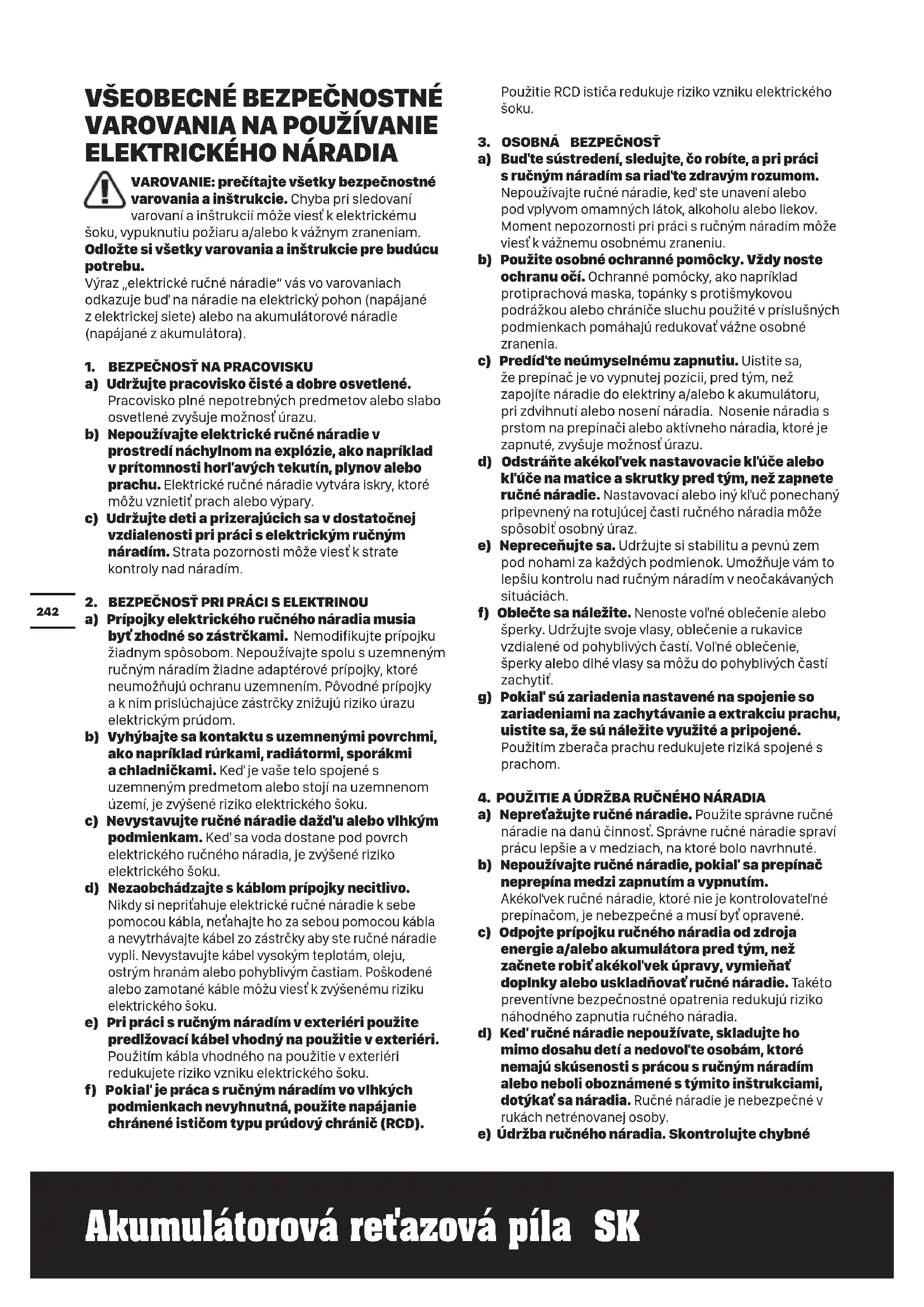 Varovanie pred nebezpečenstvom z nadzemného elektrického vedenia. Elektrické výrobky sa nesmú likvidovať spolu s domácim odpadom. Recyklujte v zberných miestach na tento účel zriadených. O možnosti recyklácie sa informujte na miestnych úradoch alebo u predajcu. Batérie nezahadzujte. Vyčerpané batérie odneste do miestneho zberného (recyklačného) miesta špeciálneho odpadu. Nespaľujte ich Nevystavujte dažďu alebo vode Vyvarujte sa kontaktu špičky reťazovej lišty s akýmkoľvek predmetom Kontakt špičky reťazovej lišty s obrobkom môže spôsobiť náhly odskok lišty nahor a späť, čo môže viesť k vážnemu úrazu obsluhy. Pri rezaní držte pílu vždy obidvomi rukami.248 Akumulátorová reťazová píla SK