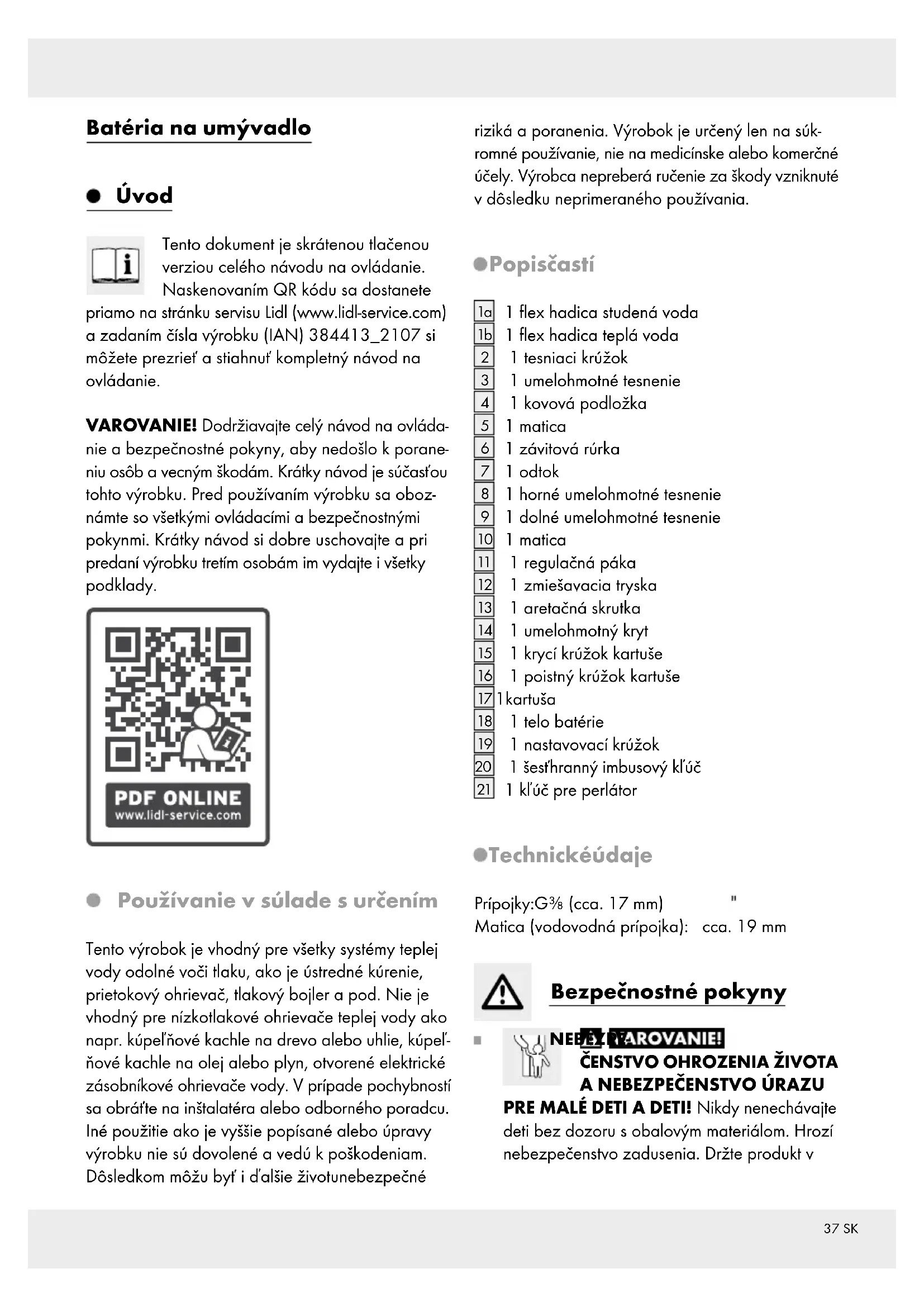 1 kľúč pre perlátor Technické údaje Prípojky: G⅜ (cca. 17 mm) Matica (vodovodná prípojka): cca. 19 mm Bezpečnostné pokyny NEBEZPE-