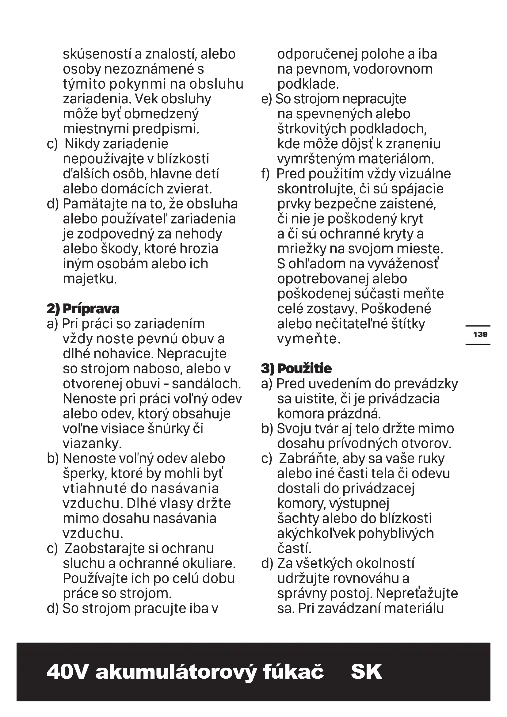 a) Pozorne si prečítajte nasledujúce pokyny. Zoznámte sa s ovládacími prvkami a so správnym použitím tohoto zariadenia. b) Nikdy nenechávajte obsluhovať toto zariadenie deti, osoby so zníženými fyzickými, zmyslovými alebo duševnými schopnosťami, alebo nedostatkom139 9DNXPXOiWRURYìI~NDĀ 6. skúseností a znalostí, alebo osoby nezoznámené s týmito pokynmi na obsluhu zariadenia. Vek obsluhy môže byť obmedzený miestnymi predpismi. c) Nikdy zariadenie nepoužívajte v blízkosti ďalších osôb, hlavne detí alebo domácích zvierat. d) Pamätajte na to, že obsluha alebo používateľ zariadenia je zodpovedný za nehody alebo škody, ktoré hrozia iným osobám alebo ich majetku.
