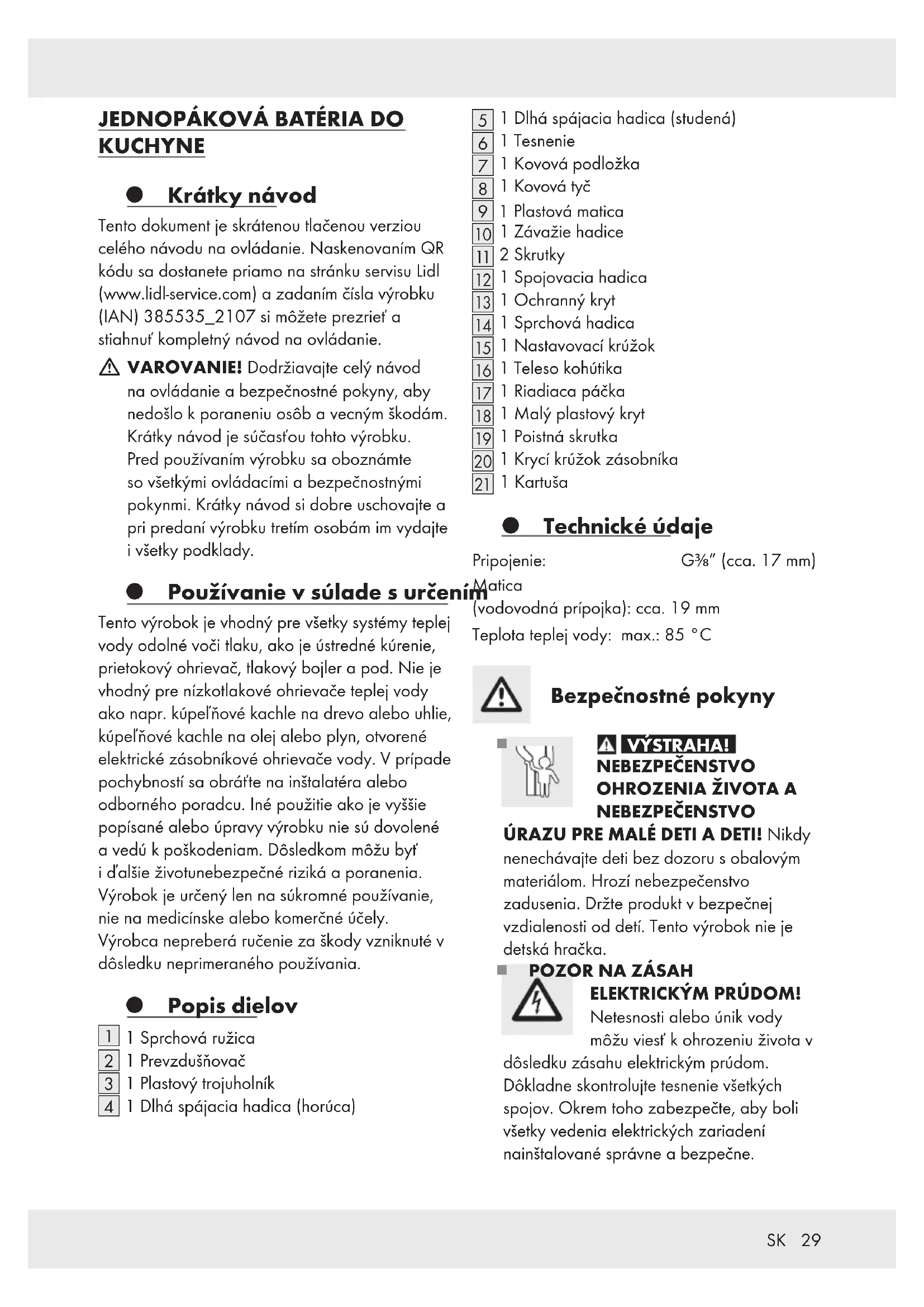 VAROVANIE! Dodržiavajte celý návod na ovládanie a bezpečnostné pokyny, aby nedošlo k poraneniu osôb a vecným škodám. Krátky návod je súčasťou tohto výrobku. Pred používaním výrobku sa oboznámte so všetkými ovládacími a bezpečnostnými pokynmi. Krátky návod si dobre uschovajte a pri predaní výrobku tretím osobám im vydajte i všetky podklady. Používanie v súlade s určením Tento výrobok je vhodný pre všetky systémy teplej vody odolné voči tlaku, ako je ústredné kúrenie, prietokový ohrievač, tlakový bojler a pod. Nie je vhodný pre nízkotlakové ohrievače teplej vody ako napr. kúpeľňové kachle na drevo alebo uhlie, kúpeľňové kachle na olej alebo plyn, otvorené elektrické zásobníkové ohrievače vody. V prípade pochybností sa obráťte na inštalatéra alebo odborného poradcu. Iné použitie ako je vyššie popísané alebo úpravy výrobku nie sú dovolené a vedú k poškodeniam. Dôsledkom môžu byť i ďalšie životunebezpečné riziká a poranenia. Výrobok je určený len na súkromné používanie, nie na medicínske alebo komerčné účely. Výrobca nepreberá ručenie za škody vzniknuté v dôsledku neprimeraného používania. Popis dielov [1] 1 Sprchová ružica [2] 1 Prevzdušňovač [3] 1 Plastový trojuholník [4] 1 Dlhá spájacia hadica (horúca) [5] 1 Dlhá spájacia hadica (studená) [6] 1 Tesnenie [7] 1 Kovová podložka [8] 1 Kovová tyč [9] 1 Plastová matica