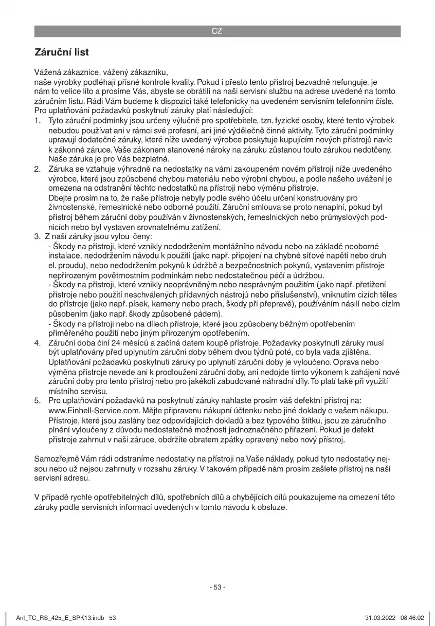 www.Einhell-Service.com. Prosíme, aby ste mali k dispozícii účtenku alebo iné doklady o zakúpení nového prístroja. Prístroje, ktoré budú zaslané bez príslušných dokladov alebo bez typového štítku, budú vylúčené zo záručného plnenia kvôli nedostatočnej možnosti identifi kácie. Ak spadá defekt prístroja pod naše záručné plnenie, dostanete obratom naspäť opravený alebo nový prístroj. Samozrejme Vám radi opravíme nedostatky na prístroji na Vaše náklady, ak tieto nedostatky nespadajú alebo už nespadajú do rozsahu záruky. Prosím, pošlite nám v takom prípade prístroj na našu servisnú adresu. Ohľadne opotrebovávaných, spotrebných a chýbajúcich dielov poukazujeme na obmedzenia tejto záruky podľa servisných informácií uvedených v tomto návode na obsluhu. Anl_TC_RS_425_E_SPK13.indb 60Anl_TC_RS_425_E_SPK13.indb 60 31.03.2022 08:46:0431.03.2022 08:46:04NL