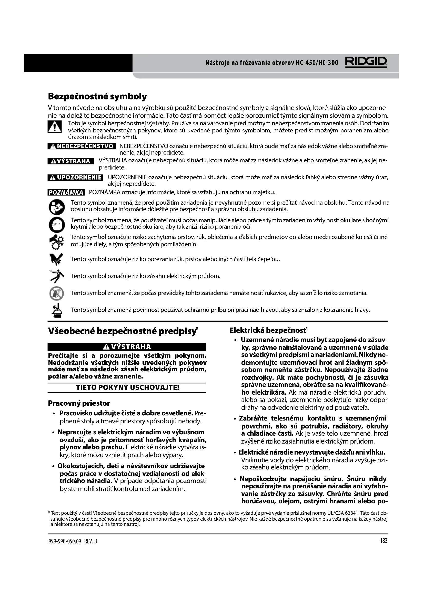 - Arzén a chróm z chemicky impregnovaného sta- vebného dreva Riziko z vystavenia sa týmto chemikáliám sa líši v závis- losti od toho, ako často vykonávate tento druh práce. Pre zníženie vystavenia sa týmto chemikáliám: pracujte v dobre vetranom priestore, a pracujte so schválenými bezpečnostnými zariadeniami, ako sú protiprachové masky, ktoré sú špeciálne navrhnuté na odltrovanie mikroskopických častíc. Ak máte akékoľvek otázky ohľadne tohto výrobku RIDGID®: – Kontaktujte miestneho distribútora výrobkov RIDGID. – Navštívte stránku RIDGID.com alebo RIDGID.eu, kde nájdete informácie o miestnom kontaktnom bode spoločnosti Ridge Tool. – Spojte sa s oddelením technických služieb spoločnosti Ridge Tool prostredníctvom e-mailu ProToolsTechService@Emerson.com alebo (v USA a Kanade) volajte na číslo 844-789-8665. Model HC-450 Popis, technické údaje a štandardné vybavenie Popis Model nástroja na frézovanie otvorov RIDGID® HC-450 je dimenzovaný na frézovanie otvorov až 4