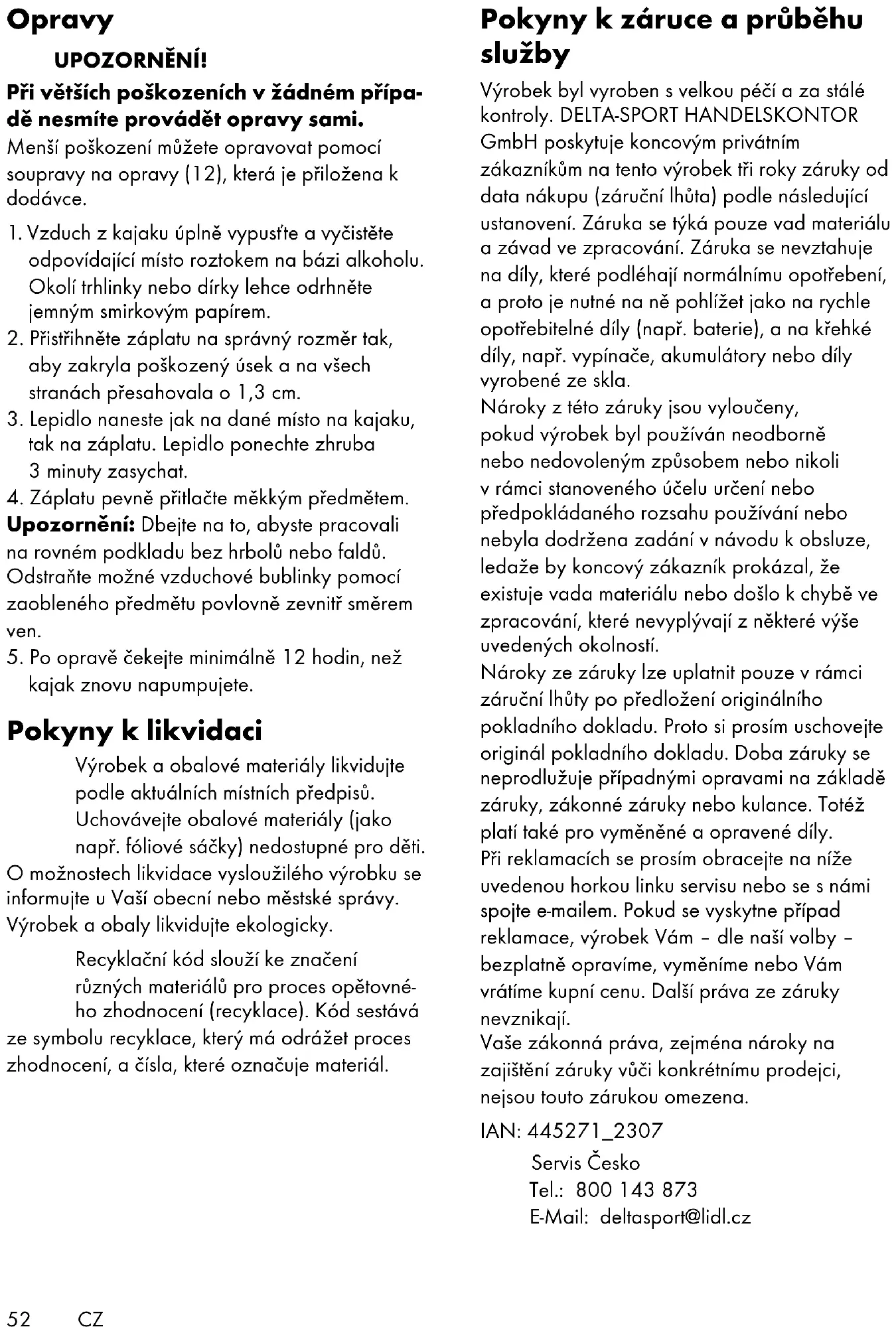 potom môžete kajak znovu nahustiť. Pokyny k likvidácii Výrobok a obalový materiál zlikvidujte podľa aktuálnych miestnych predpisov. Obalový materiál (ako napr. fóliové vrecká) uschovajte mimo dosahu detí. Ďalšie informácie o možnostiach likvidácie zastaraného výrobku dostanete na svojej obecnej alebo mestskej správe. Výrobok a obal zlikvidujte ekologicky. Recyklačný kód slúži na označenie rôznych materiálov za účelom vrátenia do kolobehu opätovného používania (recyklácia). Kód pozostáva z recyklačného symbolu pre zobrazenie kolobehu opätovného používania a čísla, ktoré označuje materiál. Pokyny k záruke a priebehu servisu Výrobok bol vyrobený veľmi starostlivo a pod stálou kontrolou. Na tento výrobok poskytuje DELTA-SPORT HANDELSKONTOR GmbH súk- romným koncovým užívateľom trojročnú záruku odo dňa kúpy (záručná lehota) po splnení nasle- dovných podmienok. Záruka platí len na chyby materiálu a spracovania. Záruka sa netýka dielov, ktoré podliehajú bežnému opotrebeniu a preto ich možno považovať za opotrebiteľné diely (napr. batérie), ako aj krehkých dielov, napr. vypínače, akumulátory alebo diely, ktoré sú vyrobené zo skla. Nároky z tejto záruky zanikajú, keď sa výrobok používal neodborne alebo nesprávne, mimo určenia na používanie alebo určeného rozsahu používania alebo neboli dodržané pokyny návodu na obsluhu, s výnimkou, že koncový uží- vateľ preukáže, že ide o chybu materiálu alebo spracovania, ktorá nebola spôsobená niektorou z hore uvedených okolností. Záruku je možné uplatniť len počas záručnej lehoty po predložení originálu pokladničného dokladu. Originál pokladničného dokladu preto prosím uschovajte. Záručná doba sa kvôli prípadným záručným opravám, zákonnej záruke alebo ako obchodné gesto nepredlžuje. Platí to aj pre vymenené a opravené diely. Pri reklamáciách sa prosím najskôr obráťte na dole uvedenú Service-Hotline alebo sa s nami spojte prostredníctvom e-mailu. Ak sa jedná o záručný prípad, výrobok – podľa našej voľby – bezplatne opravíme, vymeníme alebo vrátime kúpnu cenu. Ďalšie práva zo záruky nevyplý- vajú. Vaše zákonné práva, hlavne nároky na záručné plnenie voči príslušnému predajcovi, nie sú touto zárukou obmedzené. IAN: 445271_2307 Servis Slovensko Tel.: 0850 232001 E-Mail: deltasport@lidl.sk SK59ES ¡Enhorabuena! Con su compra se ha decidido por un artículo de gran calidad. Familiarícese con el artículo antes de usarlo por primera vez. Para ello, lea detenidamente las siguientes instrucciones de uso. Use el artículo solo de la forma descrita y para los campos de aplicación indicados. Conserve estas instrucciones de uso a buen recaudo. Entregue todos los documentos en caso de traspasar el artículo a terceros. Estas instrucciones de uso contienen informa- ción importante sobre el artículo, su montaje, funcionamiento y cuidados, así como reglas de seguridad. Como los deportes acuáticos siem- pre conllevan riesgos, el conocimiento exacto del artículo podría prevenir posibles lesiones e, incluso, la muerte de personas. Contenido de suministro (fig. A) 1 x kayak (1) 1 x protección antisalpicaduras para proa (2) 1 x asiento delantero (3) 1 x protección antisalpicaduras para popa con asiento (4) 1 x cojín triangular / reposapiés (5) 2 x remo (6) 1 x pieza central (7) 2 x anillo escurridor (8) 1 x kit de cuerdas (9) 1 x 200 cm (9a) 1 x 85 cm (9b) 3 x válvula roscada de 2 vías (10) 1 x regla de control (11) 1 x kit de reparación (12) 1 x bolsa de almacenamiento (13) 1 x petate (14) 1 x instrucciones de uso Datos técnicos Medidas (lleno de aire): Kayak: aprox. 325 x 76 x 48 cm (L x An x Al) Remo doble: Longitud: aprox. 220 cm Peso, total: aprox. 8,2 kg Presión de servicio permitida: aprox. 0,05 bar (0,73 psi) Fecha de fabricación (mes/año): 12/2023