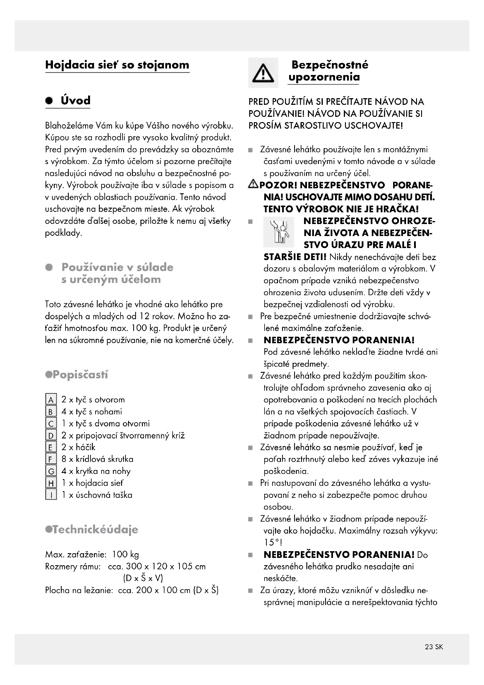1 x úschovná taška Technické údaje Max. zaťaženie: 100 kg Rozmery rámu: cca. 300 x 120 x 105 cm (D x Š x V) Plocha na ležanie: cca. 200 x 100 cm (D x Š) Bezpečnostné upozornenia PRED POUŽITÍM SI PREČÍTAJTE NÁVOD NA POUŽÍVANIE! NÁVOD NA POUŽÍVANIE SI PROSÍM STAROSTLIVO USCHOVAJTE! Závesné lehátko používajte len s montážnymi časťami uvedenými v tomto návode a v súlade s používaním na určený účel.