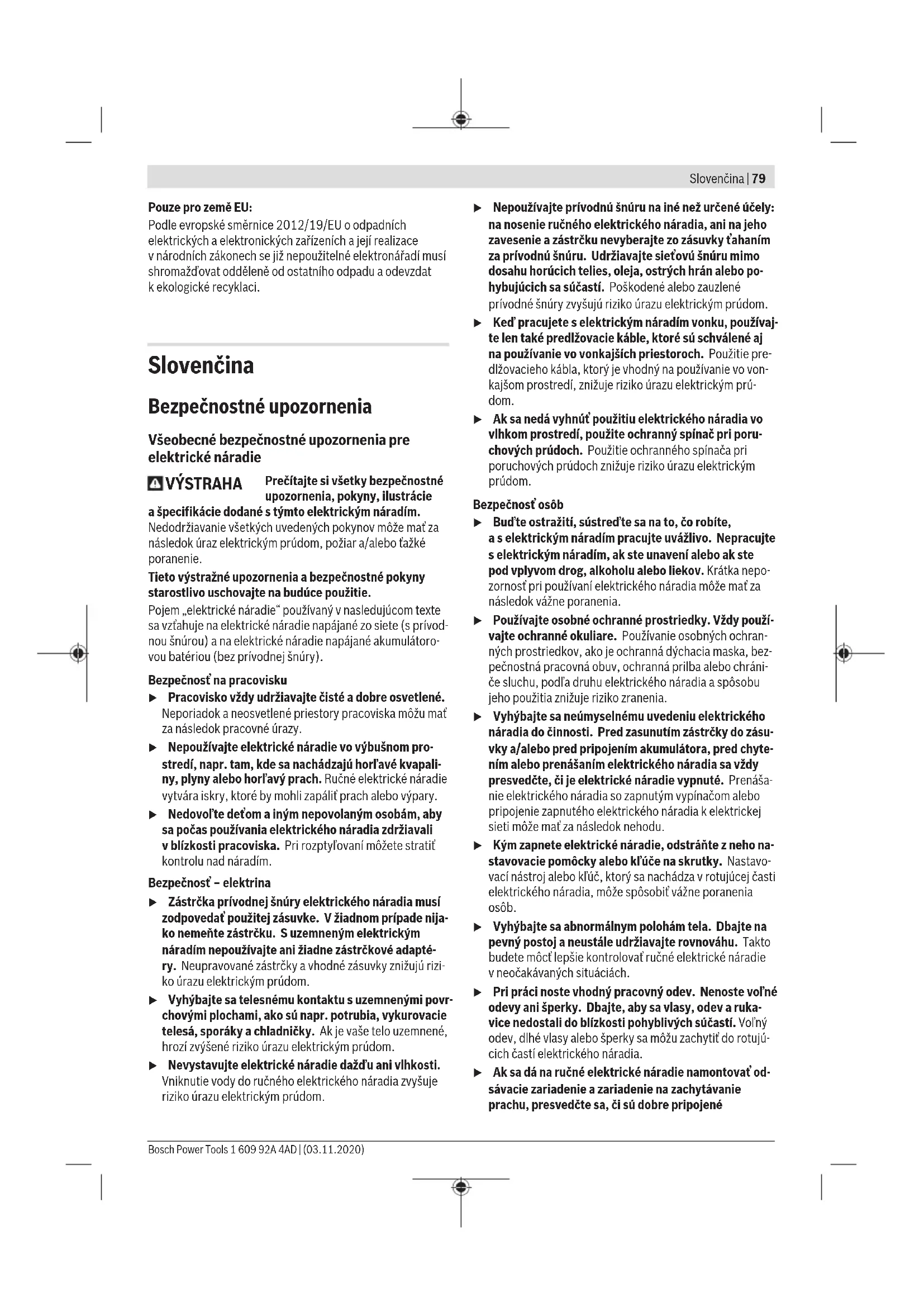 Úroveň vibrácií ahodnota emisií hluku uvedené vtýchto po- kynoch boli namerané podľa normovaného meracieho po- stupu adajú sa použiť na vzájomné porovnávanie elektrické- ho náradia. Hodia sa aj na predbežný odhad emisie vibrácií ahluku. Uvedená úroveň vibrácií ahodnota emisií hluku reprezentuje hlavné spôsoby použitia elektrického náradia. Ak sa však elektrické náradie využíva na iné spôsoby použitia, sodlišný- mi vkladacími nástrojmi alebo pri nedostatočnej údržbe, mô- že sa úroveň vibrácií ahodnota emisií hlukuodlišovať. To môže emisiu vibrácií ahluku počas celého pracovného času výrazne zvýšiť. Na presný odhad emisií vibrácií ahluku by sa mal zohľadniť aj čas, vpriebehu ktorého je náradie vypnuté alebo síce spustené, ale vskutočnosti sa nepoužíva. To môže emisie vibrácií ahluku počas celého pracovného času výrazne zní- žiť. Na ochranu obsluhujúcej osoby pred pôsobením vibrácií ur- čite doplnkové bezpečnostné opatrenia, ako napríklad: údrž- ba elektrického náradia avkladacích nástrojov, udržiavanie správnej teploty rúk, organizácia pracovných procesov. Montáž u Pred všetkými prácami na elektrickom náradí vytiah- nite sieťovú zástrčku zo zásuvky. Bosch Power Tools 1 609 92A 4AD | (03.11.2020)82 | Slovenčina Montáž základnej dosky (GSS160-1AMulti) (pozri obrázok A) 4skrutky (8) celkom vyskrutkujte. Nasaďte vhodnú základ- nú dosku askrutky znova utiahnite. Výmena brúsnej dosky (pozri obrázok A) Brúsna doska (6) sa môže vprípade potreby vymeniť. 4skrutky (8) celkom vyskrutkujte abrúsnu dosku (6) odo- berte. Nasaďte novú brúsnu dosku (6) askrutky znova utiah- nite. Výmena brúsneho listu Pred nasadením nového brúsneho listu odstráňte nečistotu aprach zbrúsnej dosky (6), napr. štetcom. Aby bolo zaručené optimálne odsávanie prachu, dbajte na to, aby sa výrezy vbrúsnom liste zhodovali sotvormi na brúsnej doske. Brúsne listy so suchým zipsom (pozri obrázok B) Keď je brúsna doska (6) vybavená suchým zipsom, brúsne listy môžete rýchlo ajednoducho upevniť suchým zipsom. Vyklepte tkaninu suchého zipsu (6) pred nasadením brúsne- ho listu (9), aby sa dal dobre upevniť. Brúsny list (9) priložte na jednu stranu brúsnej dosky (6) tak, aby sňou lícoval, potom brúsny list položte na brúsnu dosku apevne ho pritlačte. Brúsny list (9) odoberiete tak, že ho chytíte za špic aodtiah- nete od brúsnej dosky (6). Brúsny list bez suchého zipsu (pozri obrázky C–E)