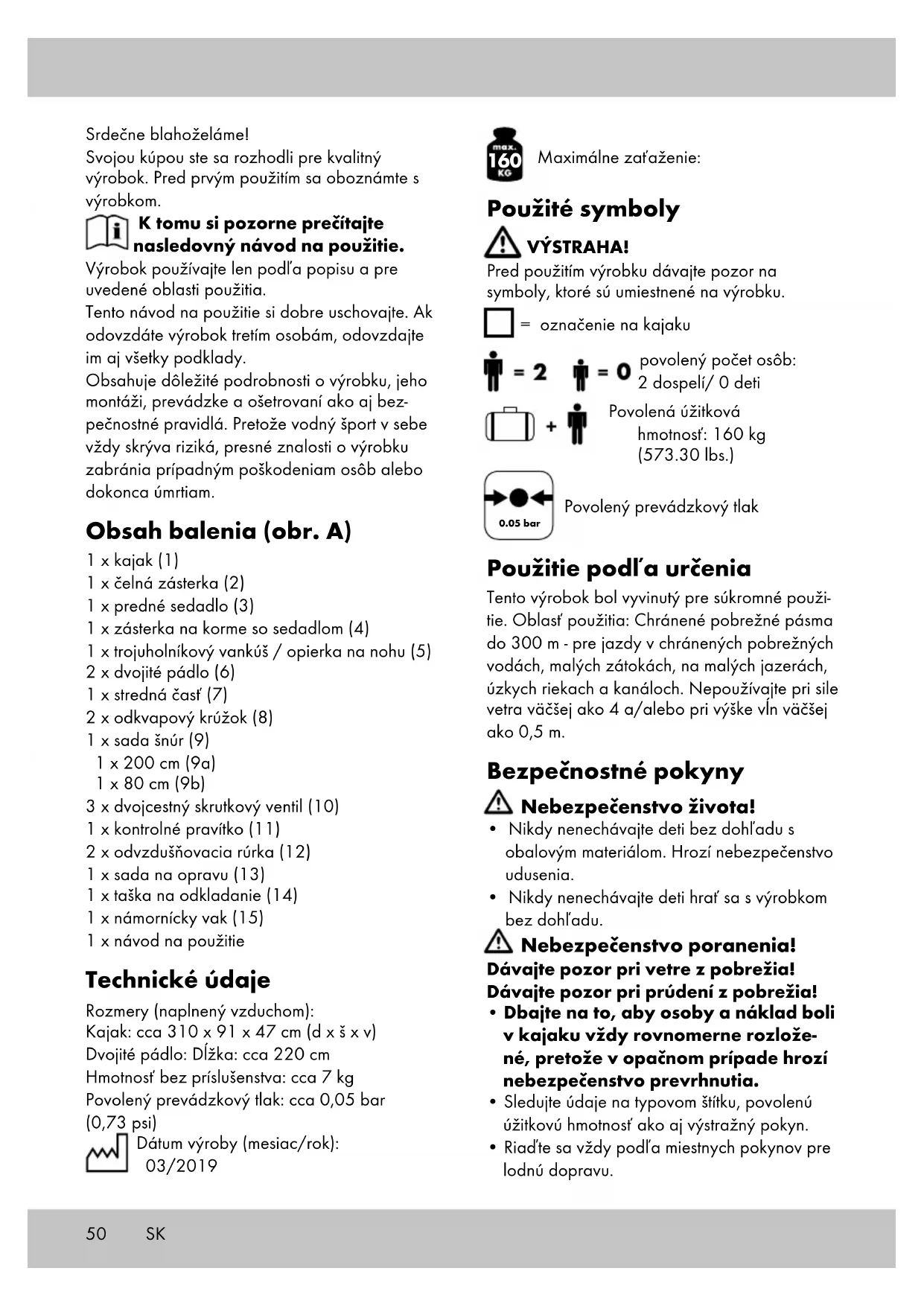Maximálne zaťaženie: Použité symboly VÝSTRAHA! Pred použitím výrobku dávajte pozor na symboly, ktoré sú umiestnené na výrobku. = označenie na kajaku povolený počet osôb: 2 dospelí/ 0 deti Povolená úžitková hmotnosť: 160 kg (573.30 lbs.)