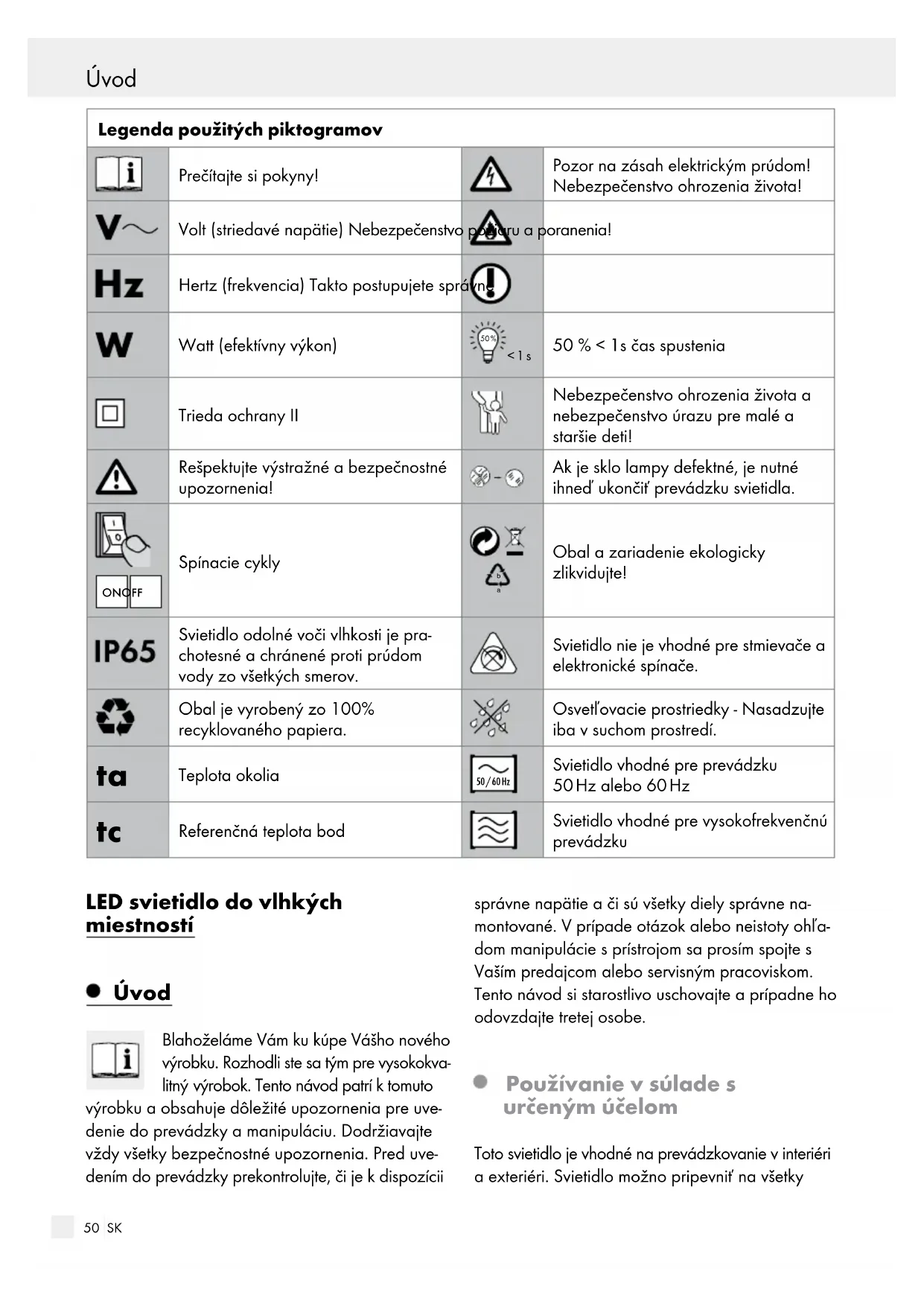 50 / 60 Hz Menovitý výkon: LED max. 18 W (vymieňateľná LED) Trieda ochrany: II / Druh ochrany: IP65 Osvetľovací prostriedok: LED, T8, G13, max. 18 W (štartér nie je potrebný) Nepoužívajte žiarivku T8, ale iba trubicu T8 LED, ktorá vyhovuje norme EN 62776 a s ta ≥ 45 °C a s označením nižšie: 50 / 60 Hz Bezpečnosť Bezpečnostné upozornenia V prípade škôd, ktoré vzniknú nedodržiavaním tohto návodu na obsluhu, zaniká garančný nárok! Pri ná- sledných škodách nepreberá výrobca ručenie! V prípade vecných škôd alebo poranenia osôb, ktoré boli zapríčinené neodbornou manipuláciou alebo nedodržiavaním bezpečnostných pokynov, nepre- berá výrobca ručenie! NEBEZPE-