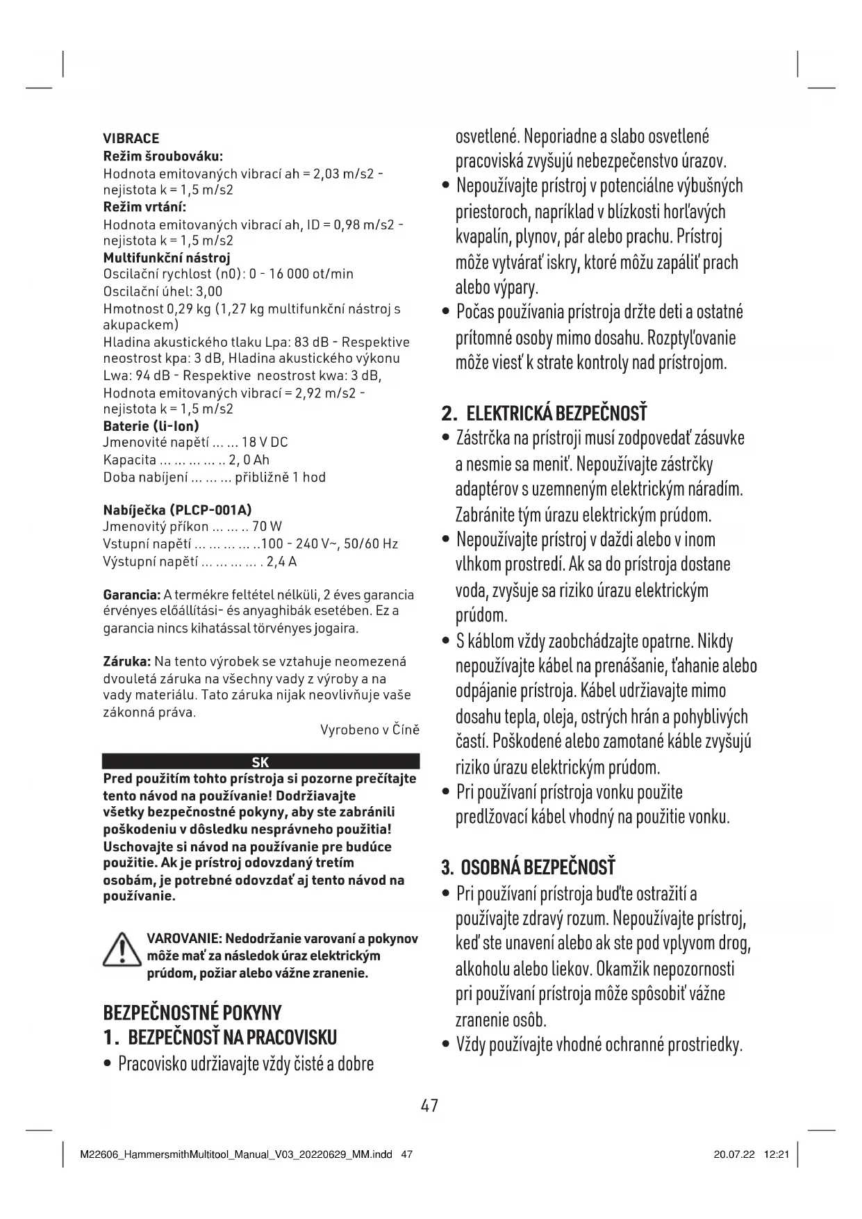 - Používajte prístroj a príslušenstvo v súlade s týmito pokynmi, pričom berte do úvahy pracovné podmienky a prácu, ktorá sa má vykonať. Používanie prístroja na iné účely, ako je určené, môže viesť k nebezpečným situáciám. M22606_HammersmithMultitool_Manual_V03_20220629_MM.indd 48M22606_HammersmithMultitool_Manual_V03_20220629_MM.indd 48 20.07.22 12:2120.07.22 12:2148