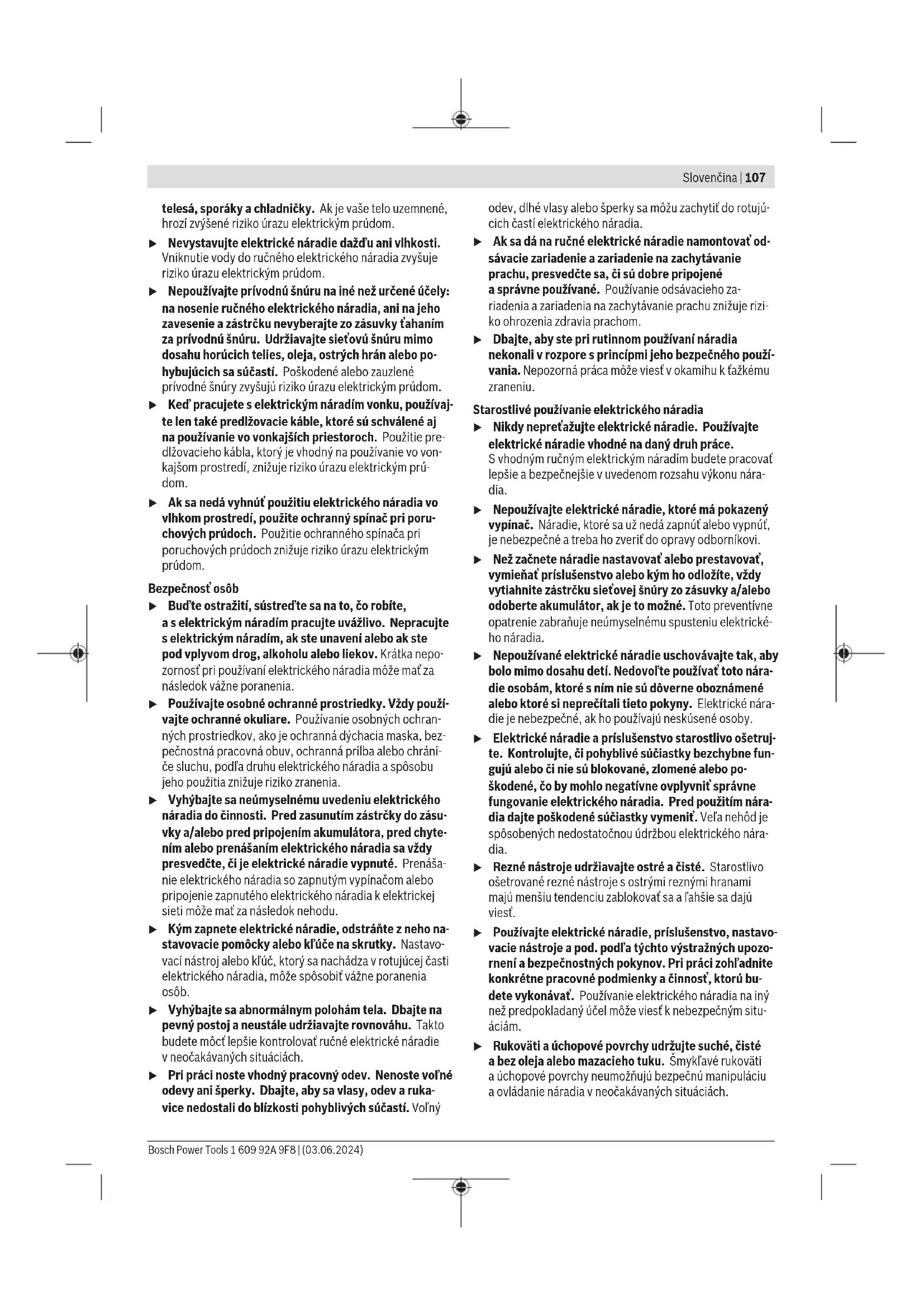 Vyznačení řezu 0° (9) vyznačuje polohu pilového kotouče při pravoúhlém řezu. Vyznačení řezu 45° (8) vyznačuje polohu pilového kotouče při řezu pod úhlem45°. Pro rozměrově přesný řez nasaďte kotoučovou pilu na obrobek tak, jak je znázorněno na obrázku. Nejlépe proveďte jeden zkušební řez. Uvedení do provozu u Dbejte na správné síťové napětí! Napětí zdroje proudu musí souhlasit súdaji na typovém štítku elektronářadí. Zapnutí avypnutí Pro zapnutí elektrického nářadí nejprve stiskněte blokování zapnutí (2) apoté stiskněte vypínač (1) adržte ho stisknutý. Pro vypnutí elektrického nářadí vypínač (1) uvolněte. Upozornění: Zbezpečnostních důvodů nelze spínač (1) zaaretovat, nýbrž musí zůstat během provozu neustále stlačený. Pracovní pokyny u Před každou prací na elektronářadí vytáhněte zástrčku ze zásuvky. Šířka řezu se liší vzávislosti na použitém pilovém kotouči. Chraňte pilový kotouč před úderem anárazem. Pro dosažení dobré kvality řezu veďte elektrické nářadí rovnoměrně asmírným posuvem ve směru řezu. Příliš velký posuv výrazně zkracuje životnost nástrojů amůže poškodit elektrické nářadí. Vždy pracujte se stejnoměrným posuvem a dbejte na to, aby otáčky pilového kotouče byly konstantní. Nezvětšujte posuv (např. při řezání vlhkého dřeva, tlakově impregnovaného stavebního dřeva nebo dřeva se suky) a zabraňte tak s tím spojenému snížení otáček, aby nedošlo k přehřátí zubů pilového kotouče. Výkon řezání akvalita řezu podstatně závisí na stavu atvaru zubů pilového kotouče. Používejte proto jen ostré pilové kotouče vhodné na řezaný materiál. Když začínáte řezat nebo pokračujete vřezání, vystřeďte pilový kotouč ve spáře řezu azajistěte, aby zuby kotouče nebyly zaseknuté vobrobku. Zabráníte tak zpětnému rázu nebo vyjetí pilového kotouče zobrobku. Řezání dřeva Správná volba pilového kotouče se řídí podle druhu dřeva, kvality dřeva, azda jsou požadovány podélné, nebo příčné řezy. Při podélných řezech do smrkového dřeva vznikají dlouhé, spirálovité třísky. Bukový adubový prach je mimořádně zdraví škodlivý, proto pracujte pouze sodsáváním prachu. Řezání sparalelním dorazem (viz obrázek D) Paralelní doraz (10) umožňuje přesné řezy podél hrany obrobku, resp. řezání pruhů se stejným rozměrem. Povolte křídlový šroub (7) aprostrčte stupnici paralelního dorazu (10) otvorem vzákladní desce (12). Nastavte požadovanou šířku řezu jako hodnotu na stupnici podle odpovídající značky řezu (9), resp. (8), viz část „Vyznačení řezu“. Křídlový šroub (7) opět utáhněte. Bosch Power Tools 1 609 92A 9F8 | (03.06.2024)106 | Slovenčina Řezání spomocným dorazem (viz obrázek E) Pro řezání velkých obrobků nebo řezání rovných okrajů můžete na obrobek upevnit jako pomocný doraz prkno nebo lištu akotoučovou pilu vést základní deskou podél pomocného dorazu. Údržba aservis Údržba ačištění u Před každou prací na elektronářadí vytáhněte zástrčku ze zásuvky. u Udržujte elektronářadí avětrací otvory čisté, aby pracovalo dobře abezpečně. Je-li nutná výměna přívodního kabelu, nechte ji provést firmou Bosch nebo autorizovaným servisem pro elektronářadí Bosch, abyste zabránili ohrožení bezpečnosti. Kyvný ochranný kryt se musí vždy volně pohybovat asamostatně uzavírat. Udržujte proto oblast okolo kyvného ochranného krytu neustále čistou. Odstraňte prach atřísky štětcem. Pilové kotouče bez povrchové úpravy mohou být chráněné před korozí slabou vrstvou oleje neobsahujícího kyseliny. Před řezáním olej opět odstraňte, protože jinak se dřevo zašpiní. Zbytky pryskyřice nebo klihu na pilovém kotouči zhoršují kvalitu řezu. Pilový kotouč proto hned po použití vyčistěte. Zákaznická služba aporadenství ohledně použití Zákaznická služba zodpoví vaše dotazy kopravě aúdržbě vašeho výrobku atéž knáhradním dílům. Rozkladové výkresy ainformace onáhradních dílech najdete také na: www.bosch-pt.com Vpřípadě dotazů knašim výrobkům apříslušenství vám ochotně pomůže poradenský tým Bosch. Vpřípadě veškerých otázek aobjednávek náhradních dílů bezpodmínečně uveďte 10místné věcné číslo podle typového štítku výrobku. Czech Republic Robert Bosch odbytová s.r.o. Bosch Service Center PT K Vápence 1621/16 692 01 Mikulov Na www.bosch-pt.cz si si můžete objednat opravu Vašeho stroje nebo náhradní díly online. Tel.: +420 519 305700 Fax: +420 519 305705 E-Mail: servis.naradi@cz.bosch.com www.bosch-pt.cz Další adresy servisů najdete na: www.bosch-pt.com/serviceaddresses Likvidace Elektronářadí, příslušenství aobaly odevzdejte kekologické recyklaci. Elektronářadí nevyhazujte do domovního odpadu! Pouze pro zeměEU: Již nepoužitelná elektrická nářadí se musí likvidovat ve tříděném odpadu. Použijte určená sběrná místa. Při nesprávné likvidaci mohou odpadní elektrická aelektronická zařízení kvůli případnému obsahu nebezpečných látek poškodit životní prostředí alidské zdraví. Slovenčina Bezpečnostné upozornenia Všeobecné bezpečnostné upozornenia pre elektrické náradie VÝSTRAHA Prečítajte si všetky bezpečnostné upozornenia, pokyny, ilustrácie ašpecifikácie dodané stýmto elektrickým náradím. Nedodržiavanie všetkých uvedených pokynov môže mať za následok úraz elektrickým prúdom, požiar a/alebo ťažké poranenie. Tieto výstražné upozornenia abezpečnostné pokyny starostlivo uschovajte na budúce použitie. Pojem „elektrické náradie“ používaný vnasledujúcom texte sa vzťahuje na elektrické náradie napájané zo siete (sprívod- nou šnúrou) ana elektrick