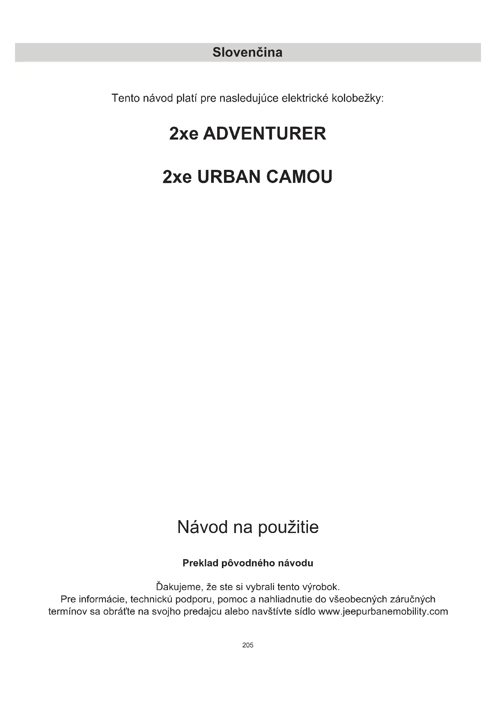 Návod na použitie Preklad pôvodného návodu Ďakujeme, že ste si vybrali tento výrobok. Pre informácie, technickú podporu, pomoc a nahliadnutie do všeobecných záručných termínov sa obráťte na svojho predajcu alebo navštívte sídlo www.jeepurbanemobility.com Slovenčina Tento návod platí pre nasledujúce elektrické kolobežky: 2xe ADVENTURER 2xe URBAN CAMOU206