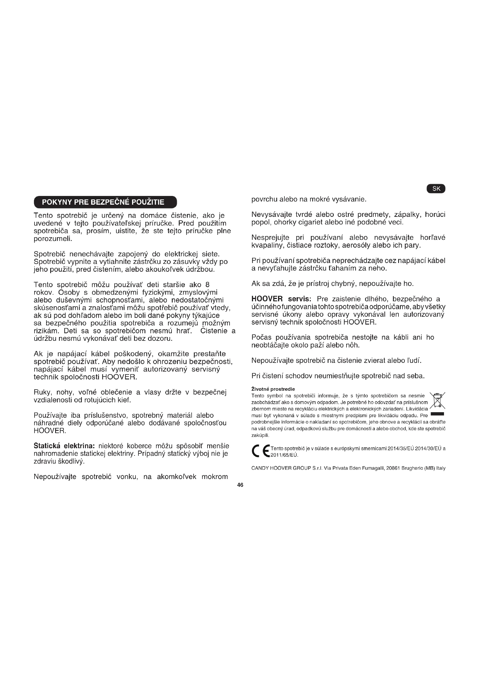 Tento spotrebič je určený na domáce čistenie, ako je uvedené v tejto používateľskej príručke. Pred použitím spotrebiča sa, prosím, uistite, že ste tejto príručke plne porozumeli. Spotrebič nenechávajte zapojený do elektrickej siete. Spotrebič vypnite a vytiahnite zástrčku zo zásuvky vždy po jeho použití, pred čistením, alebo akoukoľvek údržbou. Tento spotrebič môžu používať deti staršie ako 8 rokov. Osoby s obmedzenými fyzickými, zmyslovými alebo duševnými schopnosťami, alebo nedostatočnými skúsenosťami a znalosťami môžu spotřebič používať vtedy, ak sú pod dohľadom alebo im boli dané pokyny týkajúce sa bezpečného použitia spotrebiča a rozumejú možným rizikám. Deti sa so spotrebičom nesmú hrať. Čistenie a údržbu nesmú vykonávať deti bez dozoru. Ak je napájací kábel poškodený, okamžite prestaňte spotrebič používať. Aby nedošlo k ohrozeniu bezpečnosti, napájací kábel musí vymeniť autorizovaný servisný technik spoločnosti HOOVER. Ruky, nohy, voľné oblečenie a vlasy držte v bezpečnej vzdialenosti od rotujúcich kief. Používajte iba príslušenstvo, spotrebný materiál alebo náhradné diely odporúčané alebo dodávané spoločnosťou HOOVER. Statická elektrina: niektoré koberce môžu spôsobiť menšie nahromadenie statickej elektriny. Prípadný statický výboj nie je zdraviu škodlivý. Nepoužívajte spotrebič vonku, na akomkoľvek mokrom povrchu alebo na mokré vysávanie. Nevysávajte tvrdé alebo ostré predmety, zápalky, horúci popol, ohorky cigariet alebo iné podobné veci. Nesprejujte pri používaní alebo nevysávajte horľavé kvapaliny, čistiace roztoky, aerosóly alebo ich pary. Pri používaní spotrebiča neprechádzajte cez napájací kábel a nevyťahujte zástrčku ťahaním za neho. Ak sa zdá, že je prístroj chybný, nepoužívajte ho. HOOVER servis: Pre zaistenie dlhého, bezpečného a účinného fungovania tohto spotrebiča odporúčame, aby všetky servisné úkony alebo opravy vykonával len autorizovaný servisný technik spoločnosti HOOVER. Počas používania spotrebiča nestojte na kábli ani ho neobtáčajte okolo paží alebo nôh. Nepoužívajte spotrebič na čistenie zvierat alebo ľudí. Pri čistení schodov neumiestňujte spotrebič nad seba. Životné prostredie Tento symbol na spotrebiči informuje, že s týmto spotrebičom sa nesmie zaobchádzať ako s domovým odpadom. Je potrebné ho odovzdať na príslušnom zbernom mieste na recykláciu elektrických a elektronických zariadení. Likvidácia musí byť vykonaná v súlade s miestnymi predpismi pre likvidáciu odpadu. Pre podrobnejšie informácie o nakladaní so spotrebičom, jeho obnove a recyklácii sa obráťte na váš obecný úrad, odpadkovú službu pre domácnosti a alebo obchod, kde ste spotrebič zakúpili. Tento spotrebič je v súlade s európskymi smernicami 2014/35/EÚ 2014/30/EÚ a 2011/65/EÚ. CANDY HOOVER GROUP S.r.l. Via Privata Eden Fumagalli, 20861 Brugherio (MB) Italy SK47 *Iba u niektorých modelov **Vzhľad hubice sa môže líšiť v závislosti od modelu